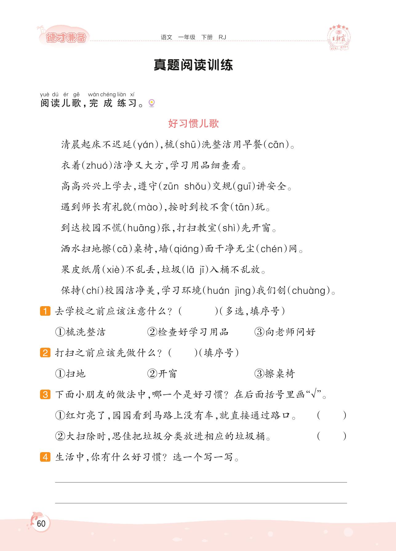 2022下册一年级语文人教版 第七单元 习惯——真题阅读训练
