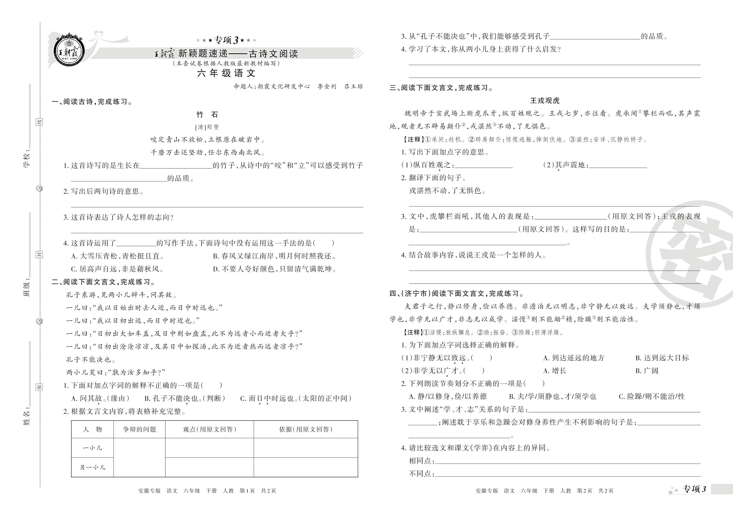 王朝霞期末专项卷——古诗文阅读、阅读理解真题归类复习六年级下册语文(人教版)【0】
