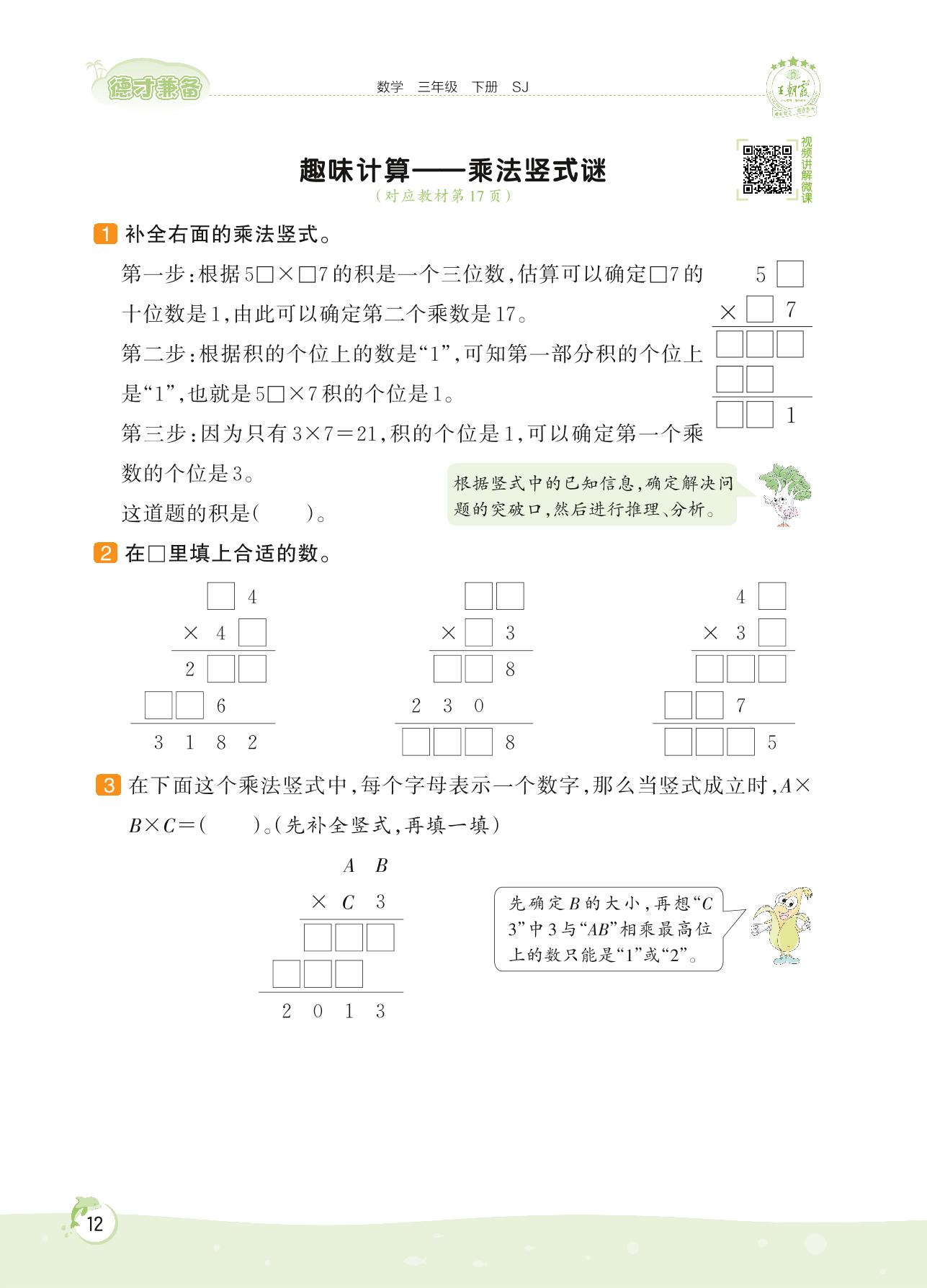 2022下册三年级数学苏教版 第一单元——趣味计算 乘法竖式谜