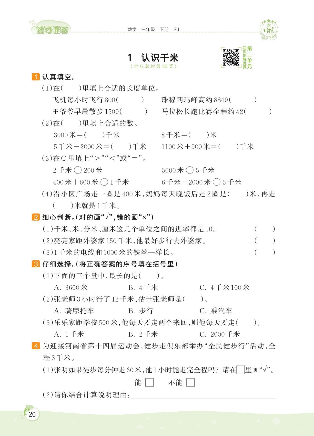 2022下册三年级数学苏教版 第二单元——1 认识千米