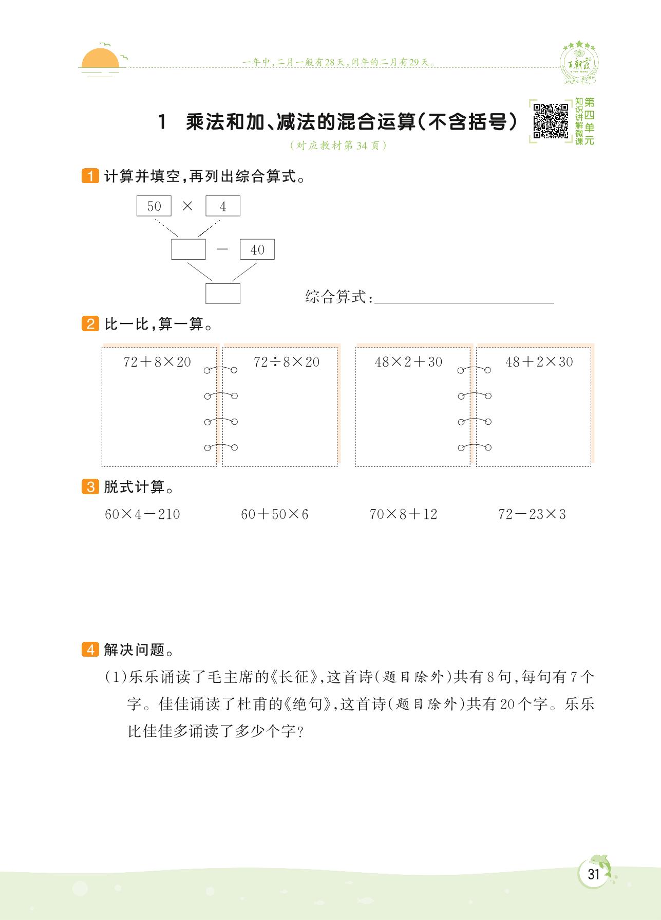 2022下册三年级数学苏教版 第四单元——1 乘法和加、减法的混合运算(不含括号)