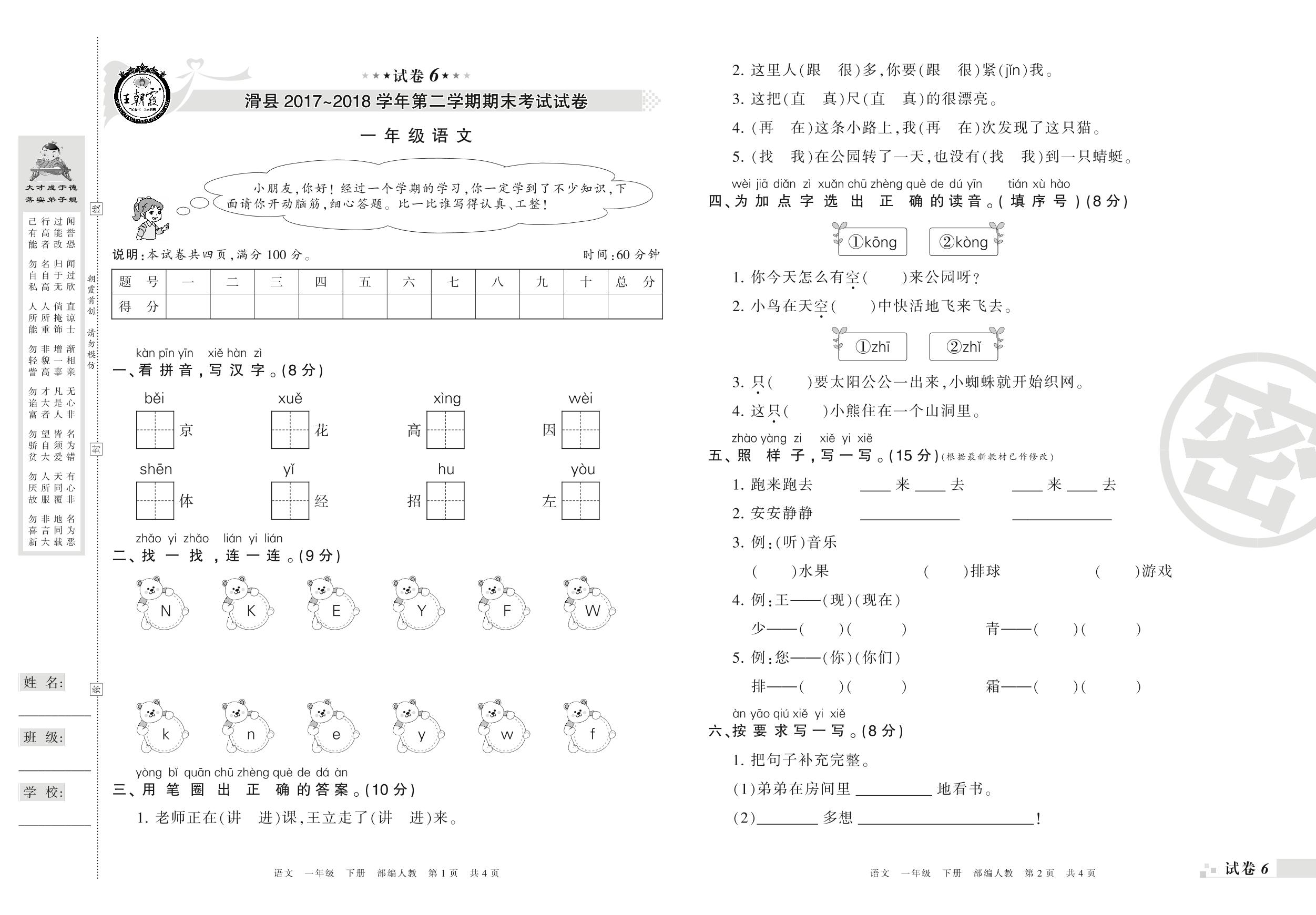 2017-2018学年第二学期安阳市滑县一年级语文试卷(人教版)【6】