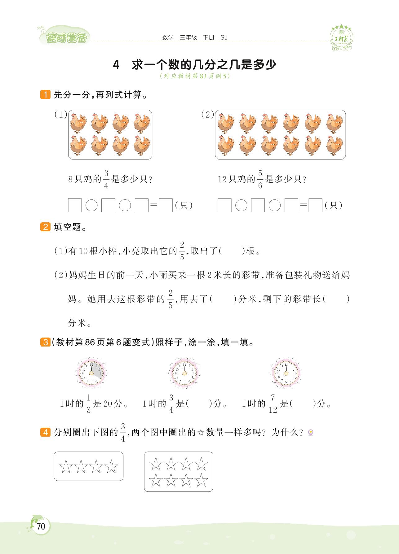 2022下册三年级数学苏教版 第七单元——4 求一个数的几分之几是多少