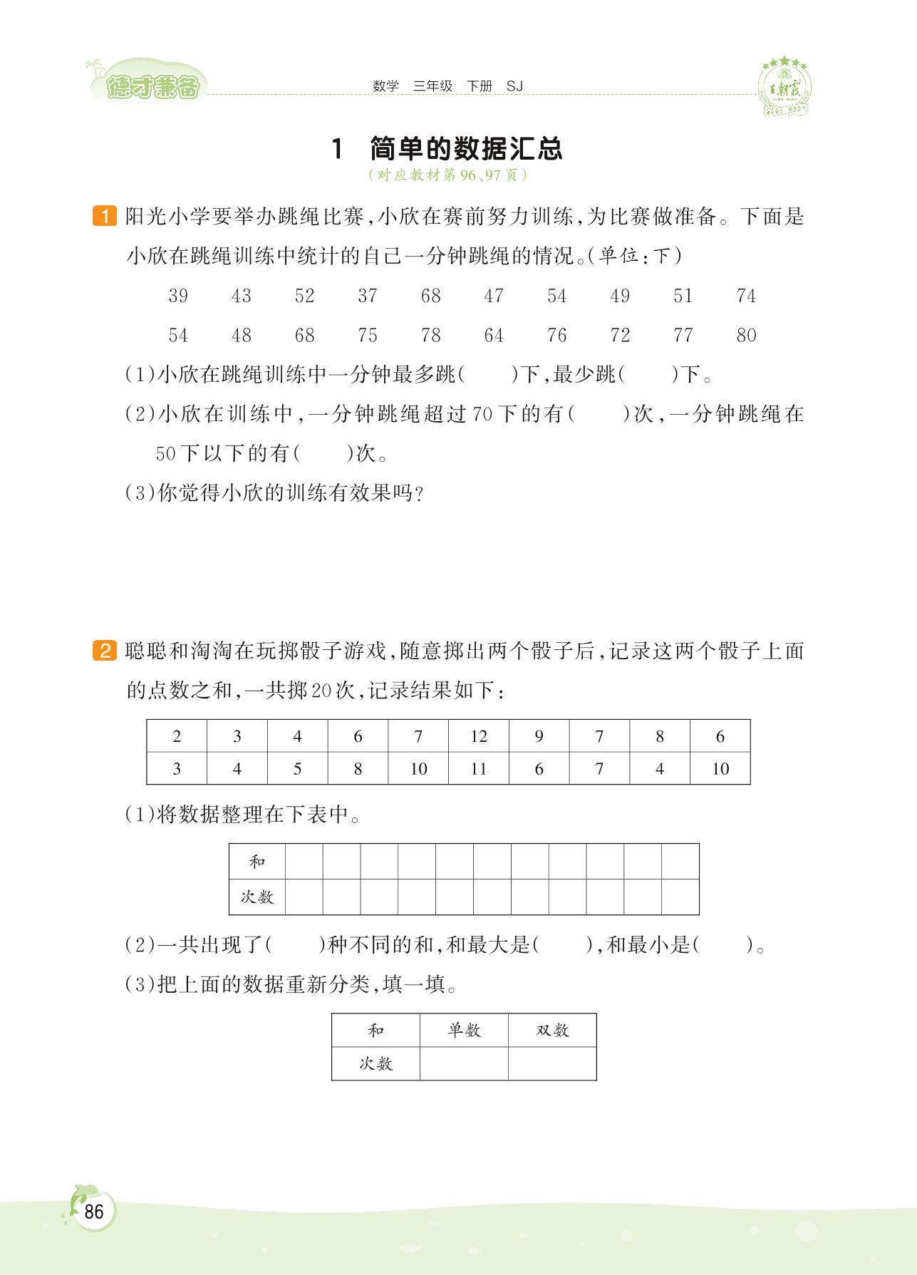 2022下册三年级数学苏教版 第九单元——1 简单的数据汇总