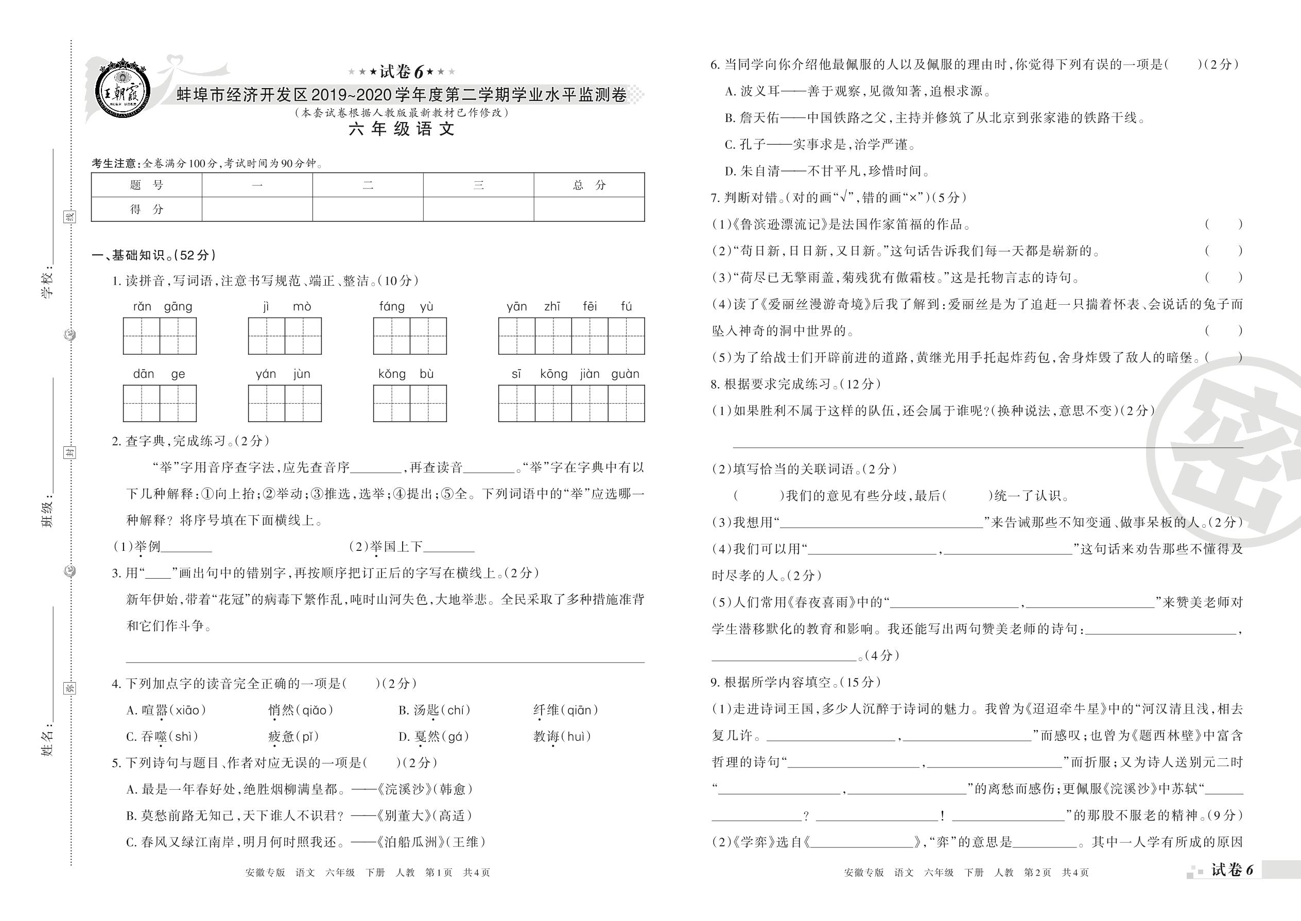 2019-2020学年第二学期蚌埠市经济开发区六年级语文试卷(人教版)【6】