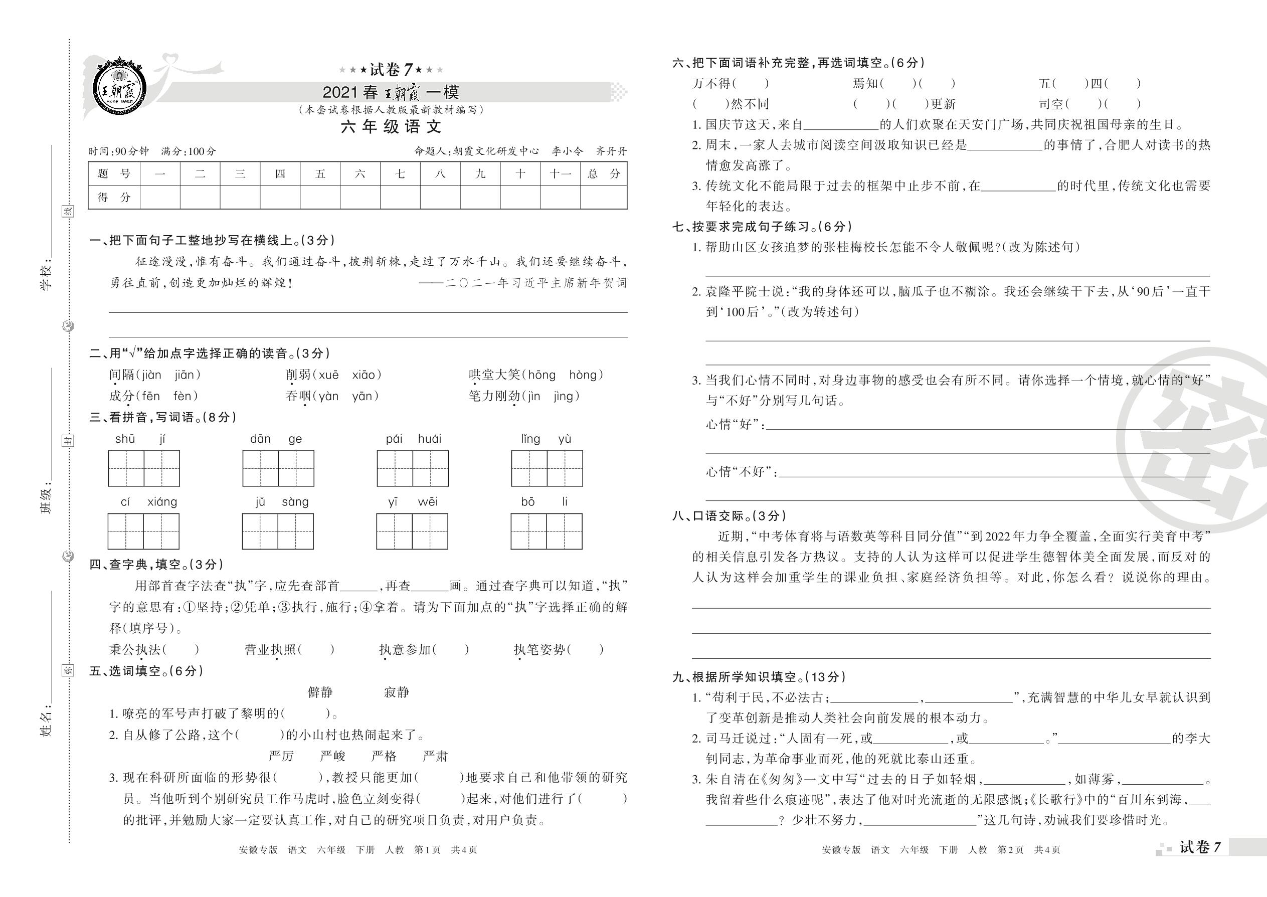 王朝霞期末模拟卷六年级下册语文(人教版)_R210802559【7】