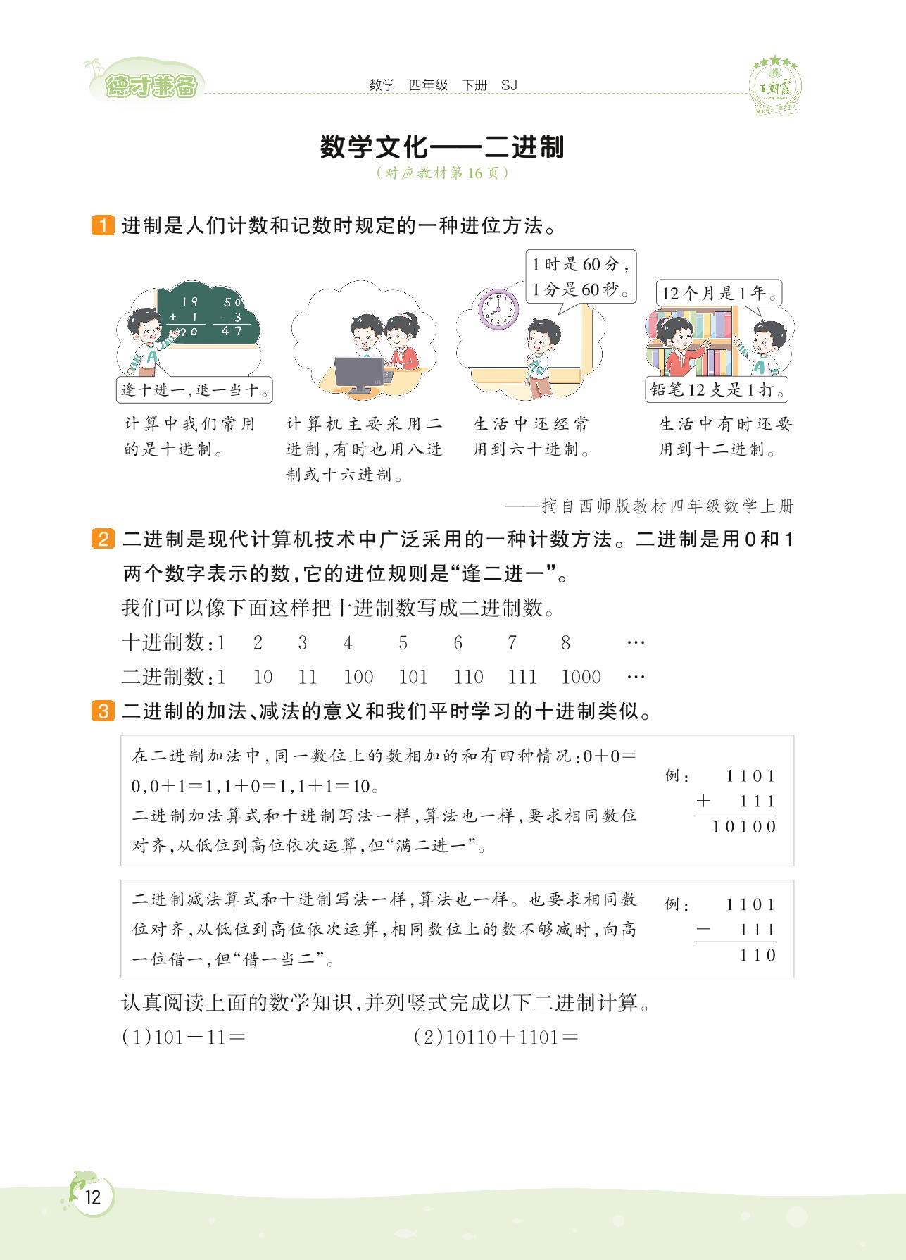 2022下册四年级数学苏教版 第二单元——数学文化 二进制