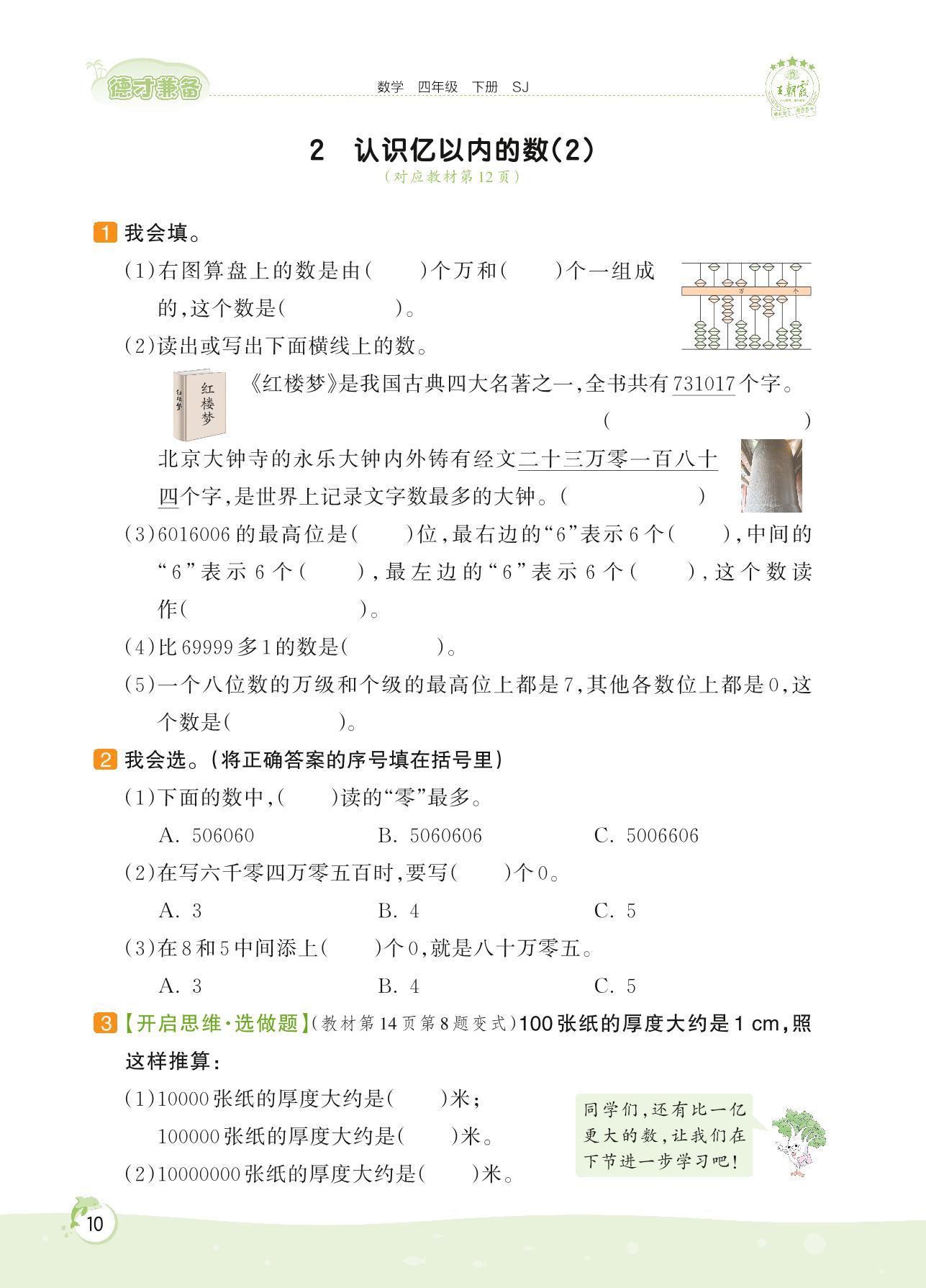 2022下册四年级数学苏教版 第二单元——2 认识亿以内的数(2)