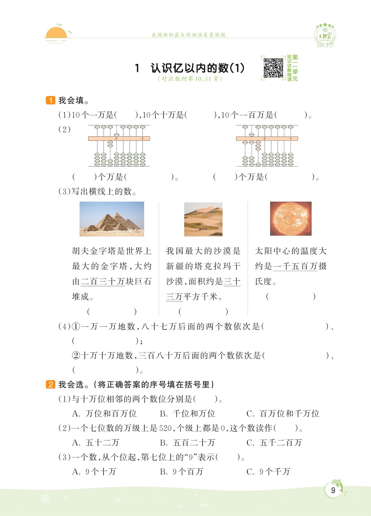2022下册四年级数学苏教版 第二单元——1 认识亿以内的数(1)