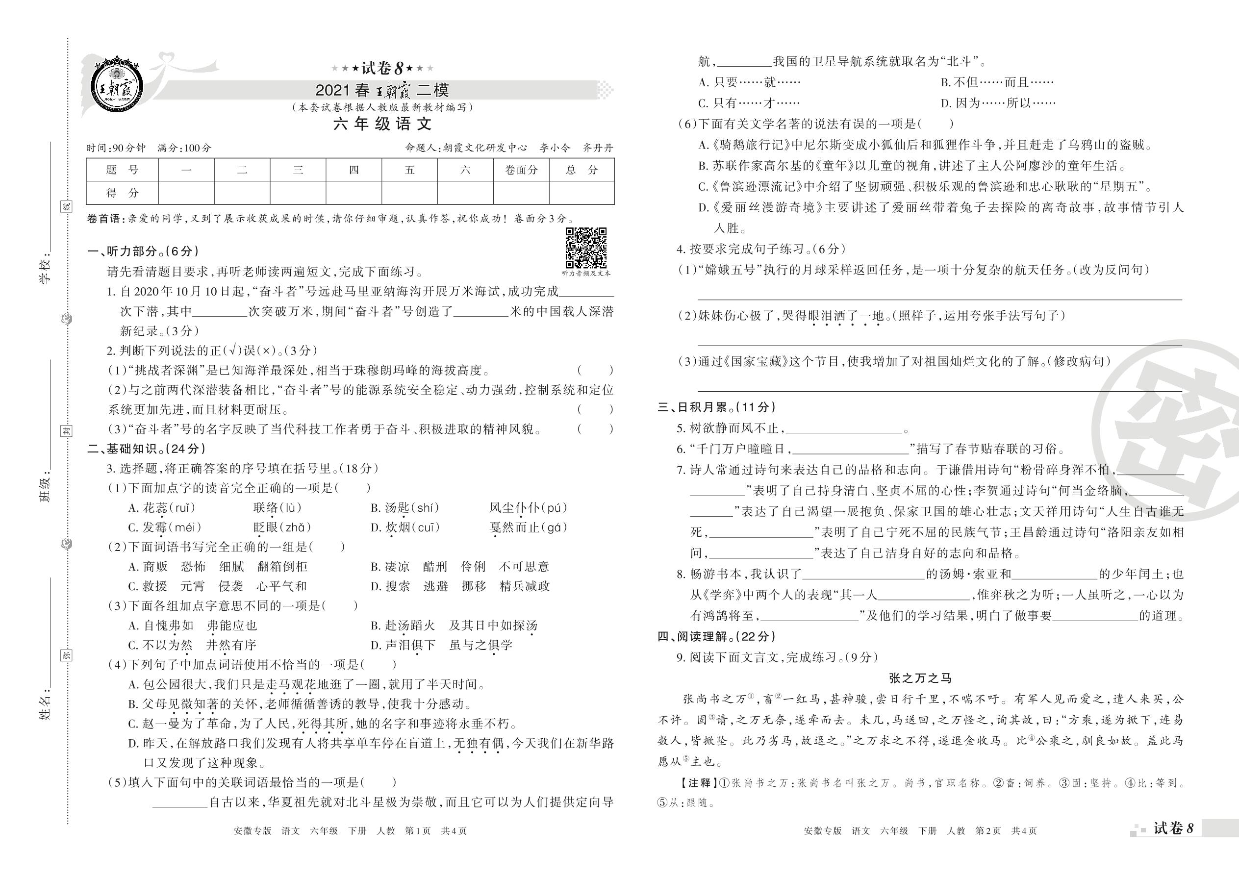 王朝霞期末模拟卷六年级下册语文(人教版)_R210802605【8】
