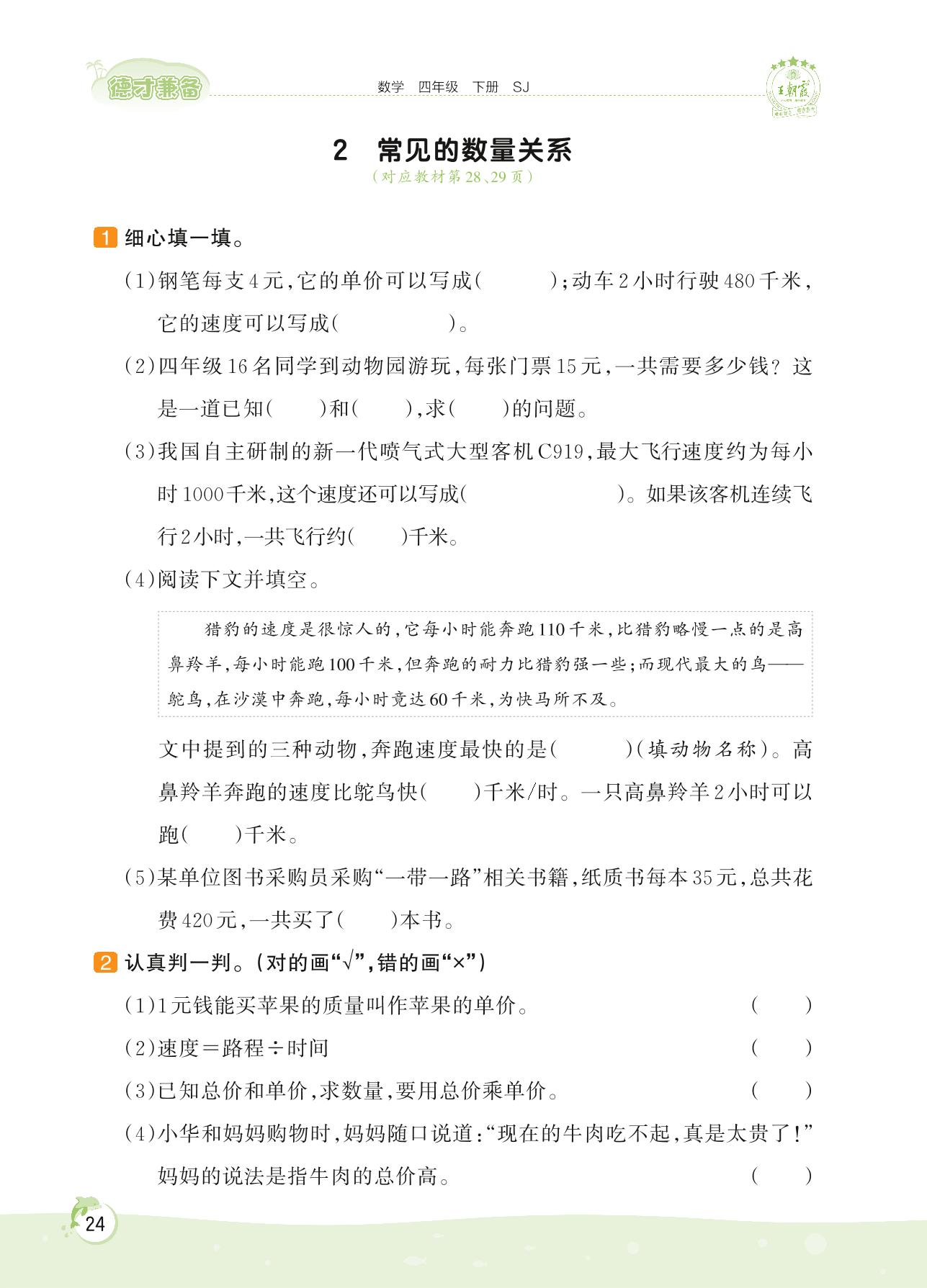 2022下册四年级数学苏教版 第三单元——2 常见的数量关系