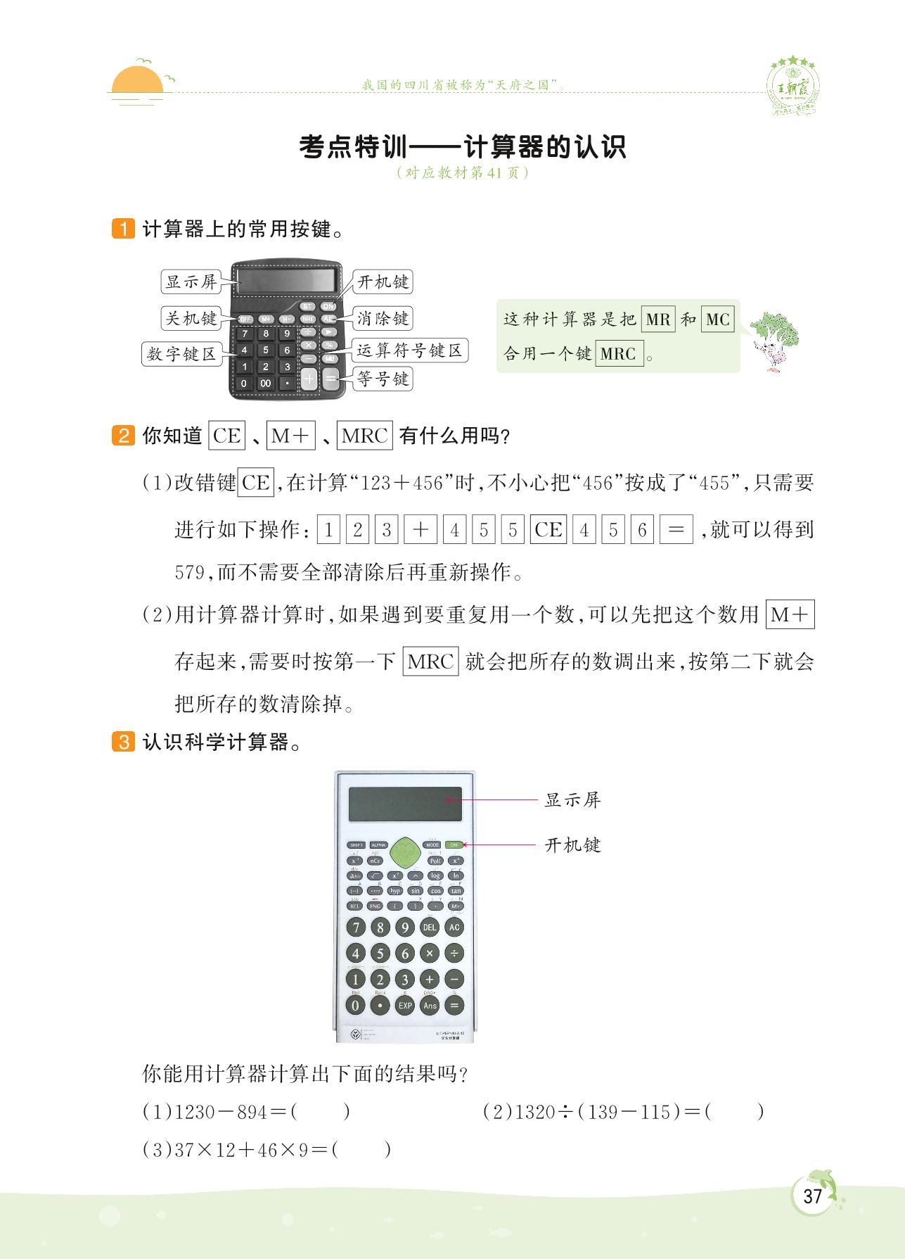 2022下册四年级数学苏教版 第四单元——考点特训 计算器的认识