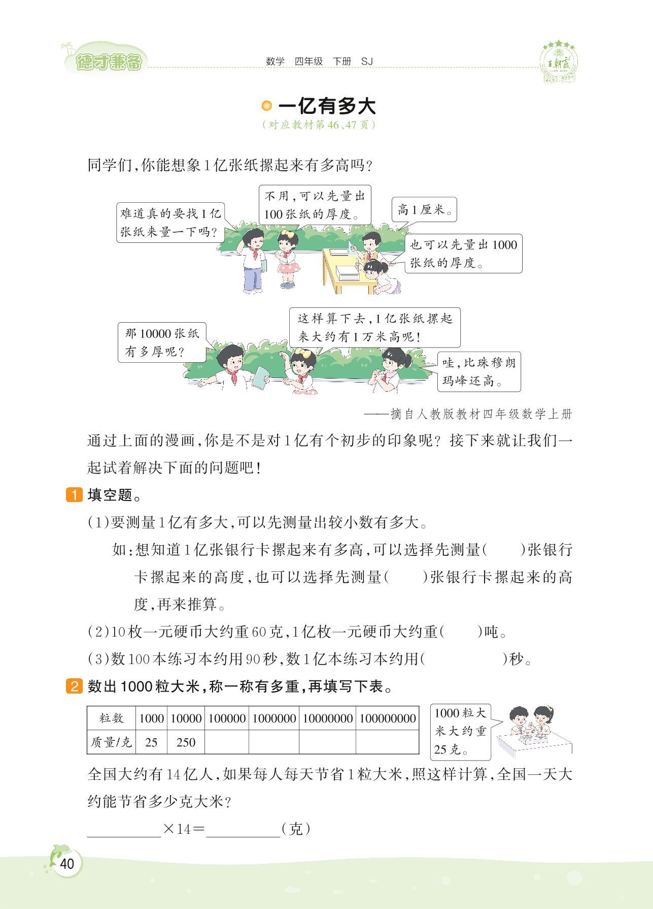 2022下册四年级数学苏教版 第四单元——一亿有多大