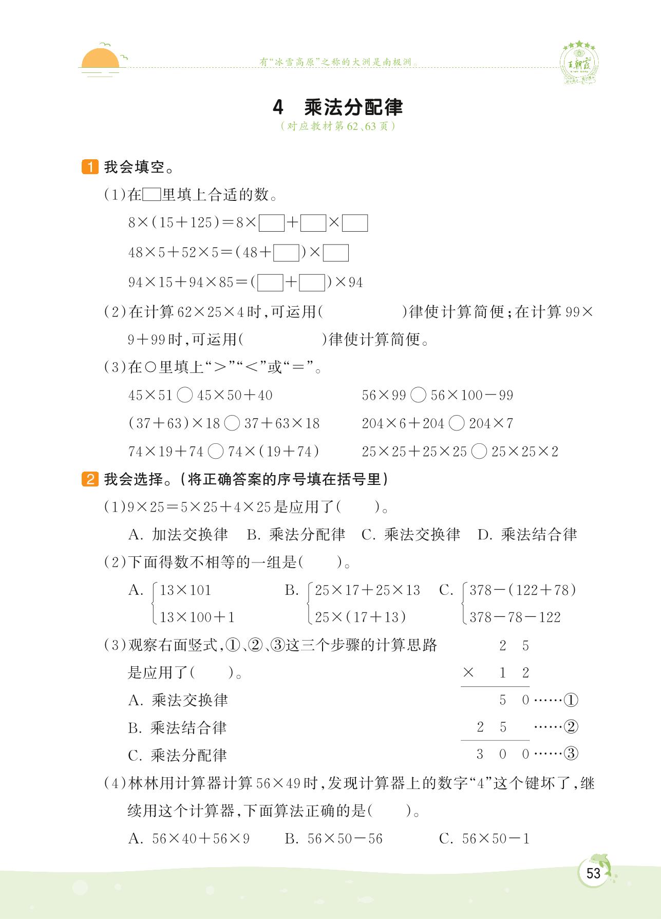 2022下册四年级数学苏教版 第六单元——4 乘法分配律