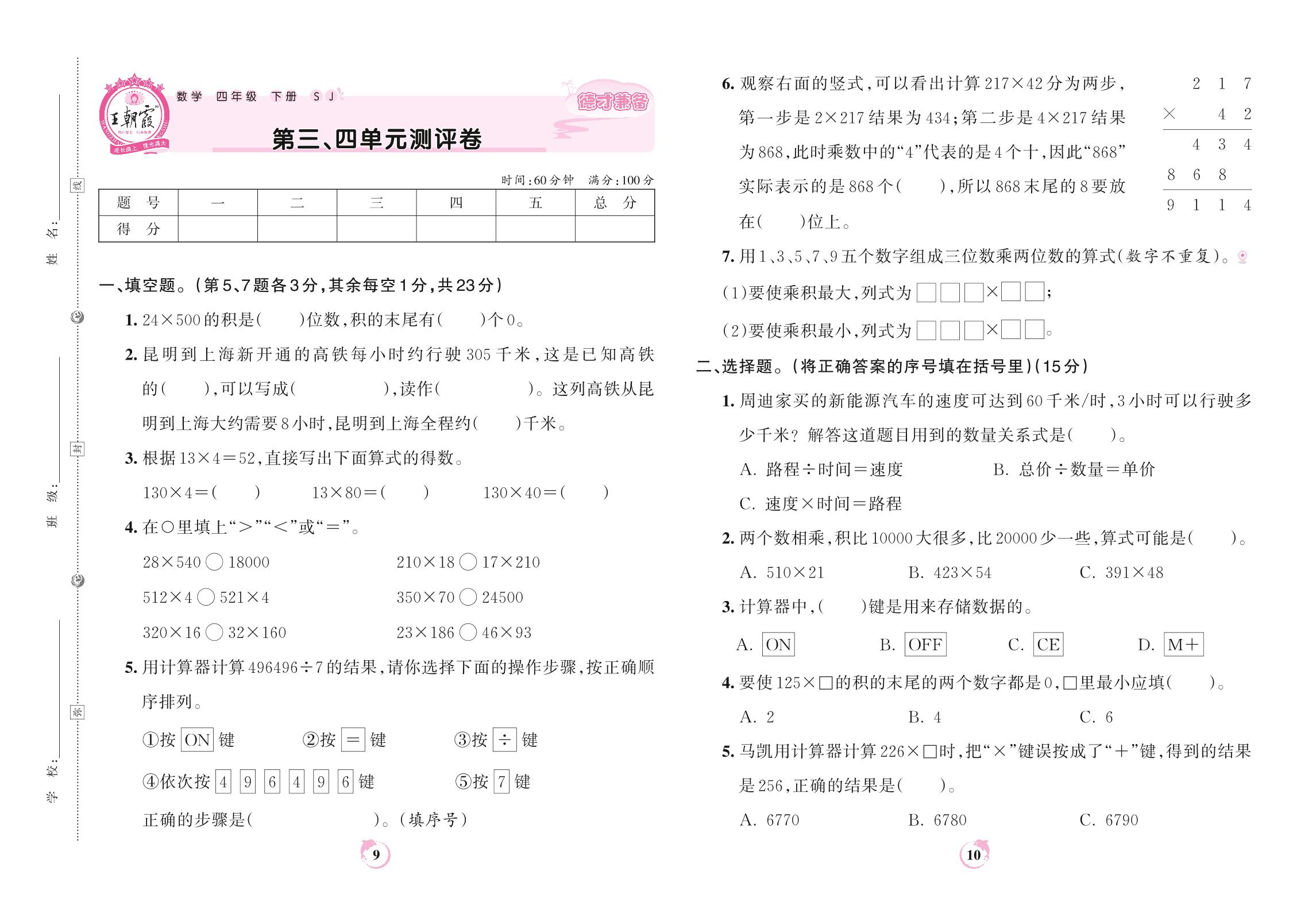 2022下册四年级数学苏教版 第三、四单元测评卷