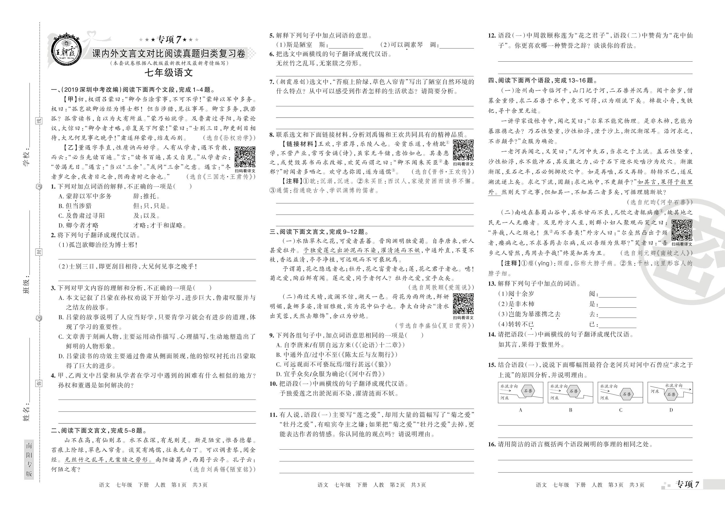 王朝霞期末专项卷——课内外文言文对比阅读、古诗词阅读真题归类复习七年级下册语文(人教版)【0】
