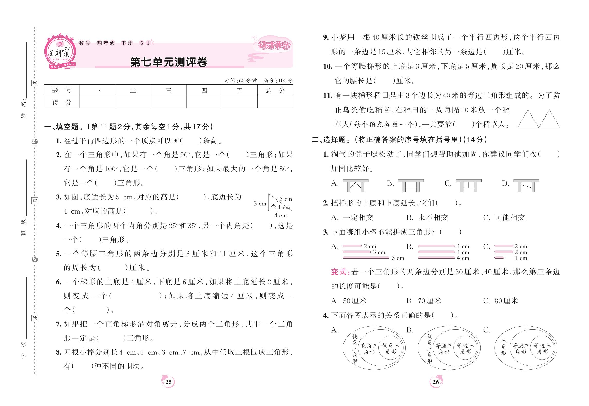 四年级数学苏教版下册单元卷