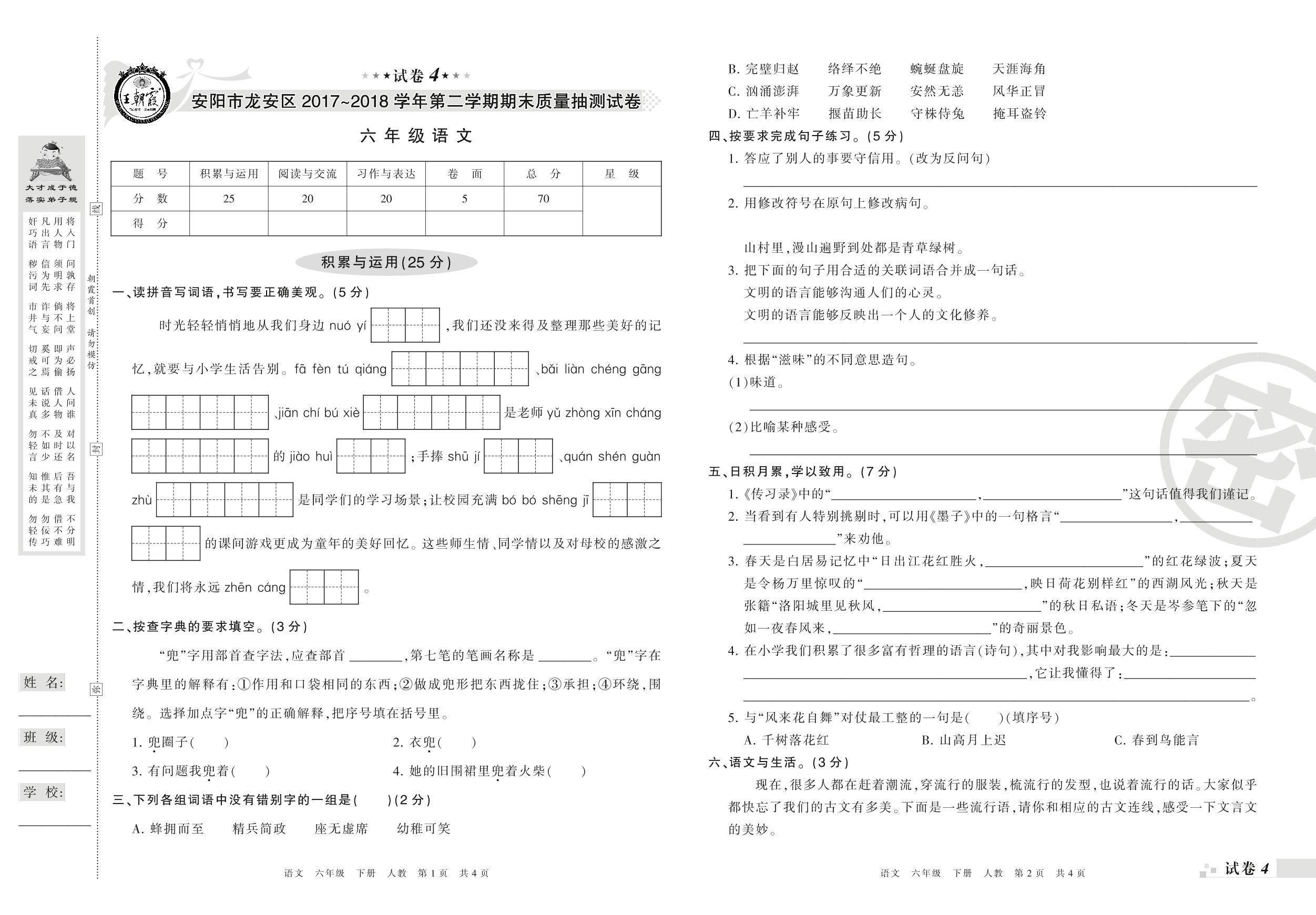 2017-2018学年第二学期安阳市龙安区六年级语文试卷(人教版)【4】