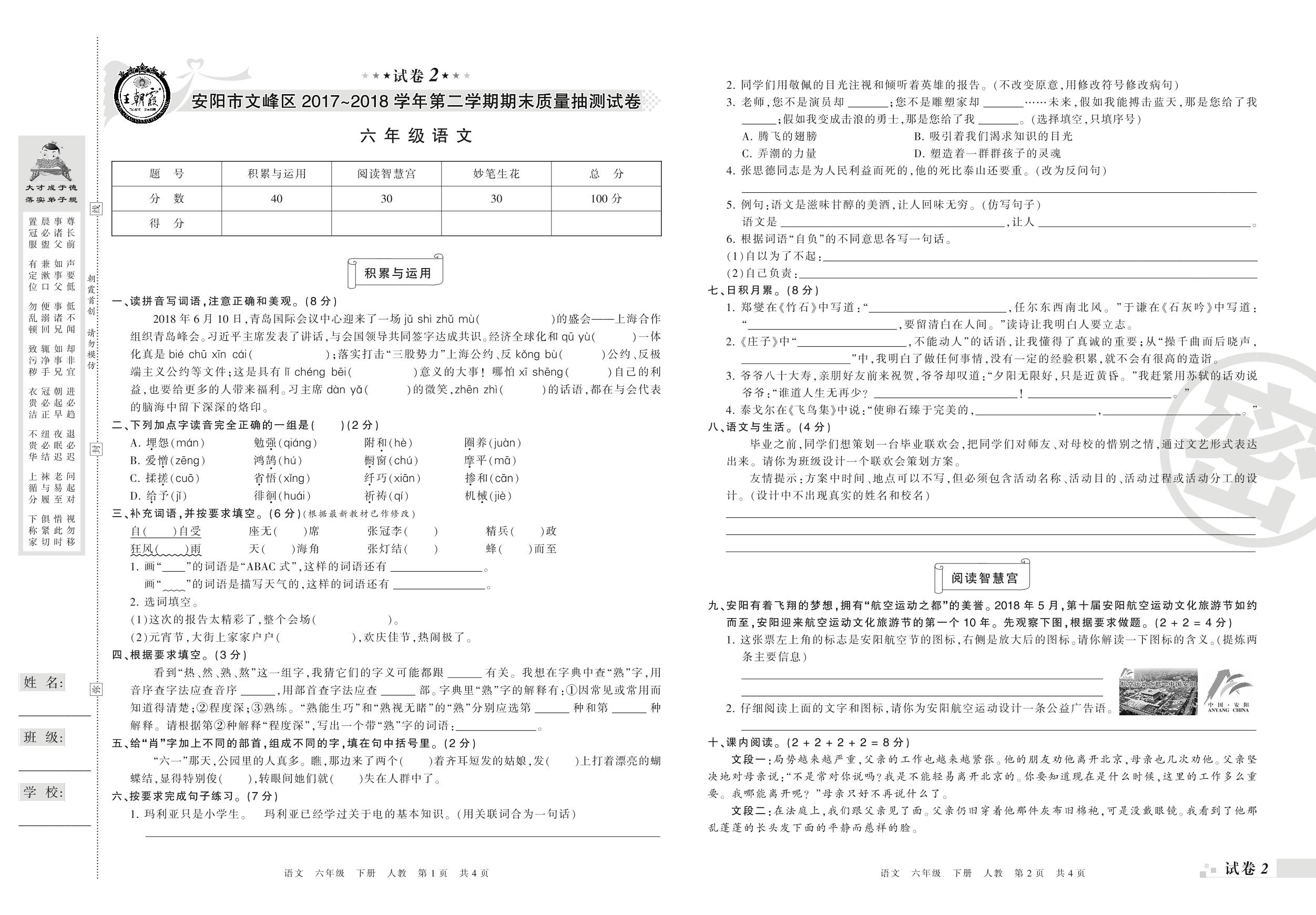 2017-2018学年第二学期安阳市文峰区六年级语文试卷(人教版)【2】