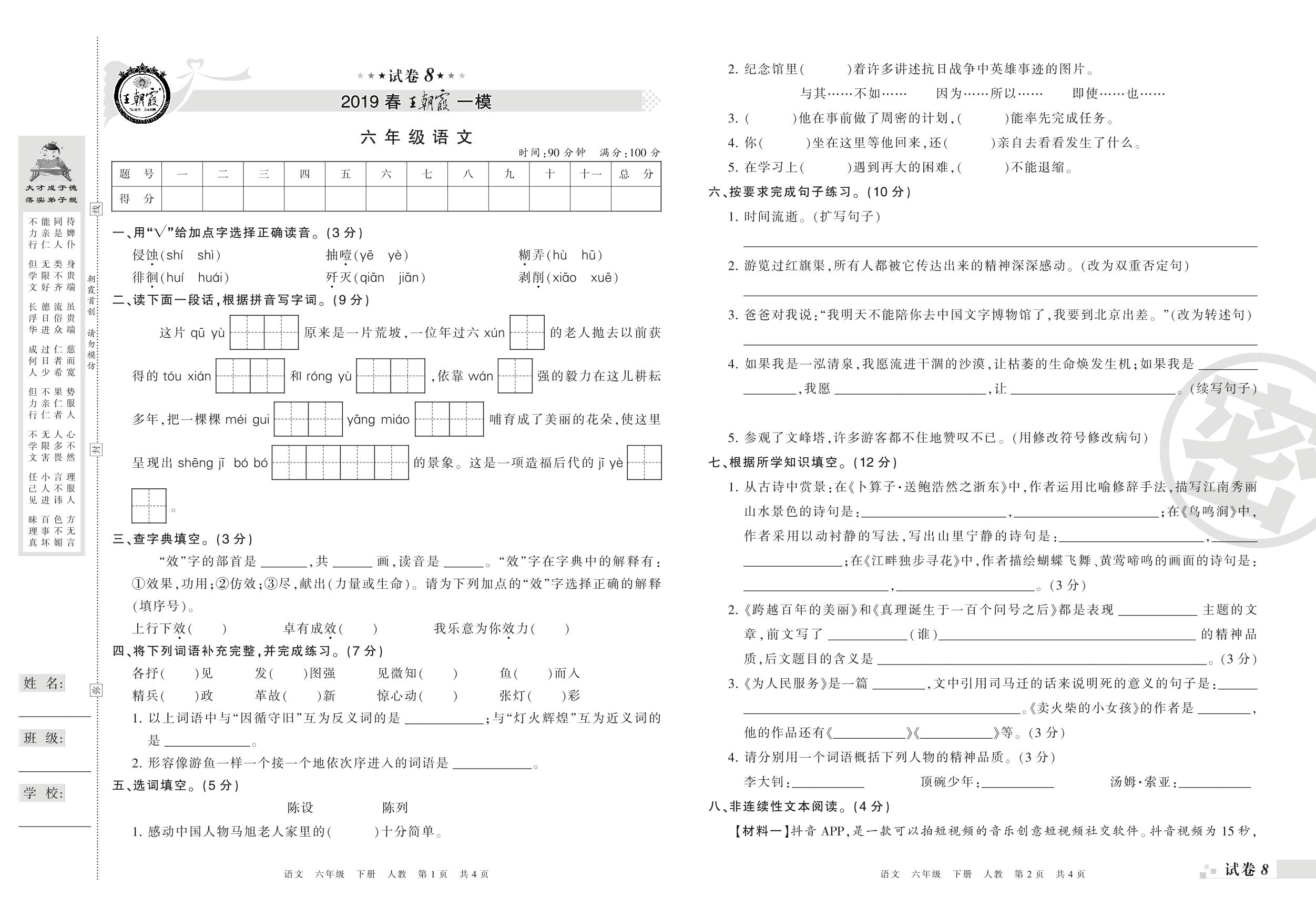 王朝霞期末模拟卷六年级下册语文(人教版)【8】