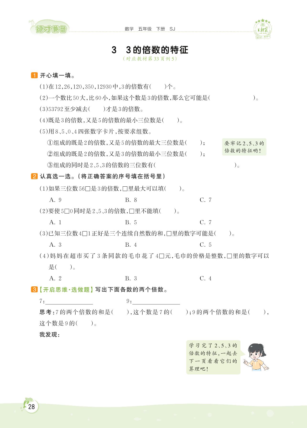 2022下册五年级数学苏教版 第三单元——3 3的倍数的特征