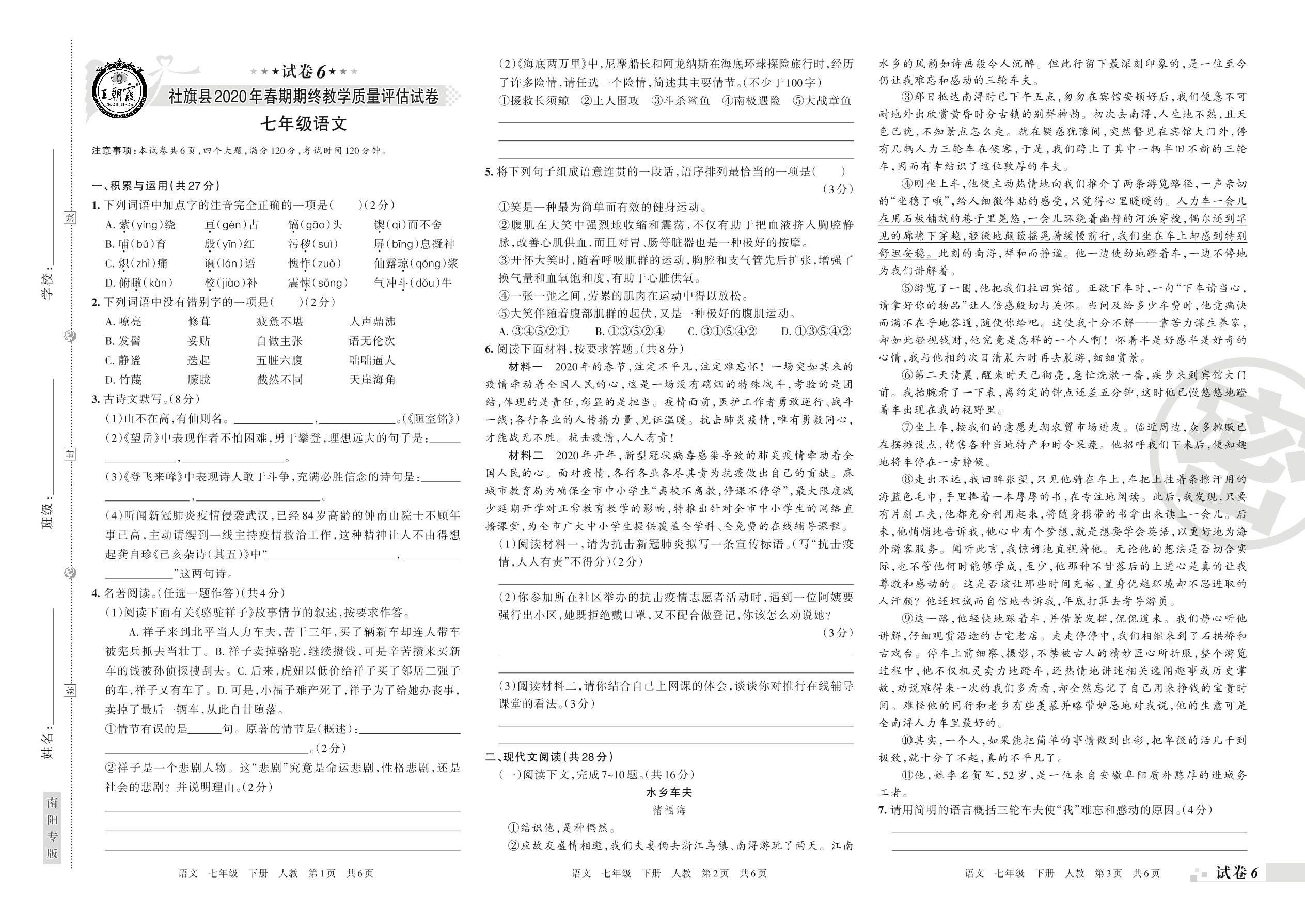 2019-2020学年第二学期南阳市社旗县七年级语文试卷(人教版)【6】