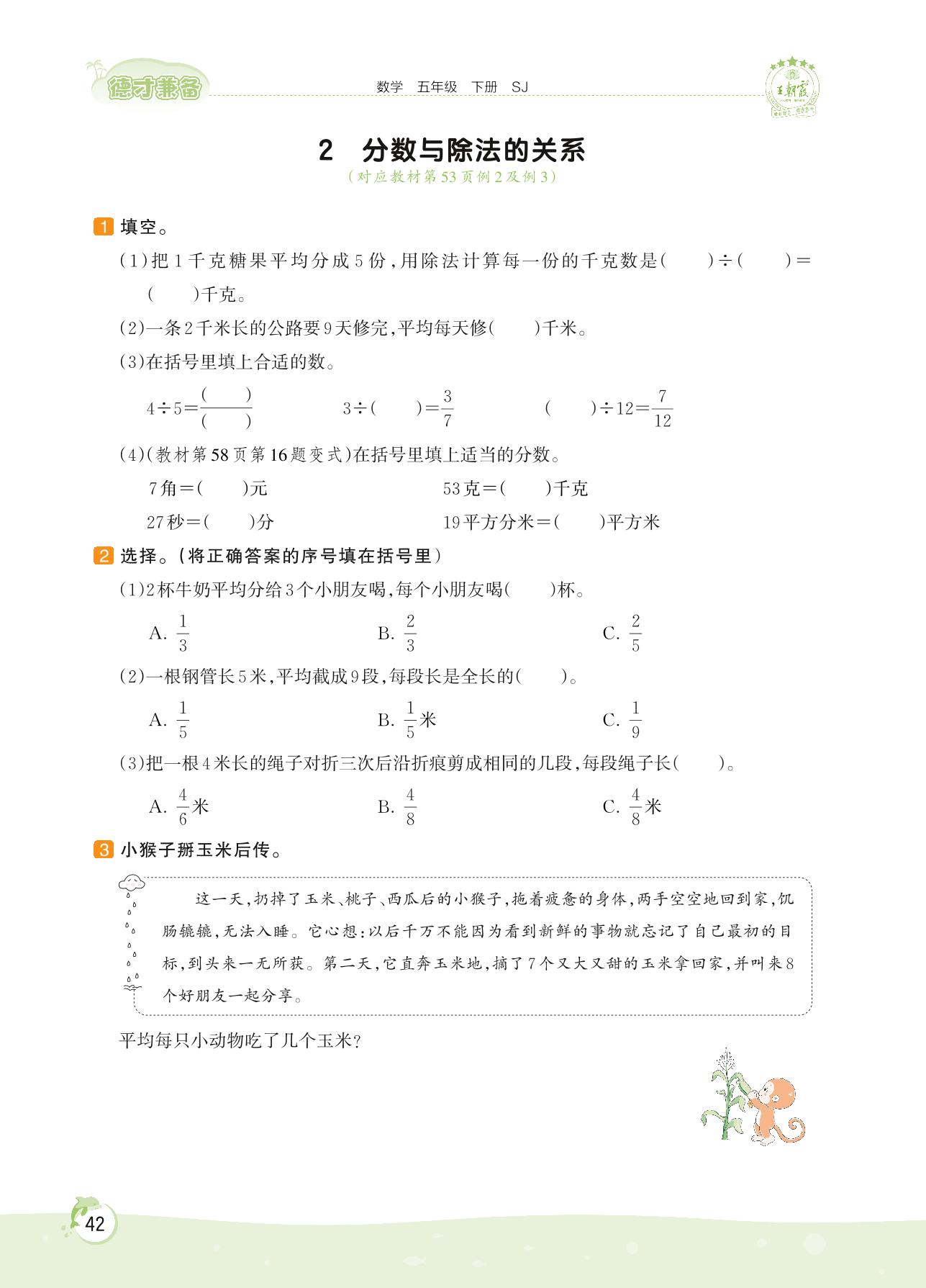 2022下册五年级数学苏教版 第四单元——2 分数与除法的关系