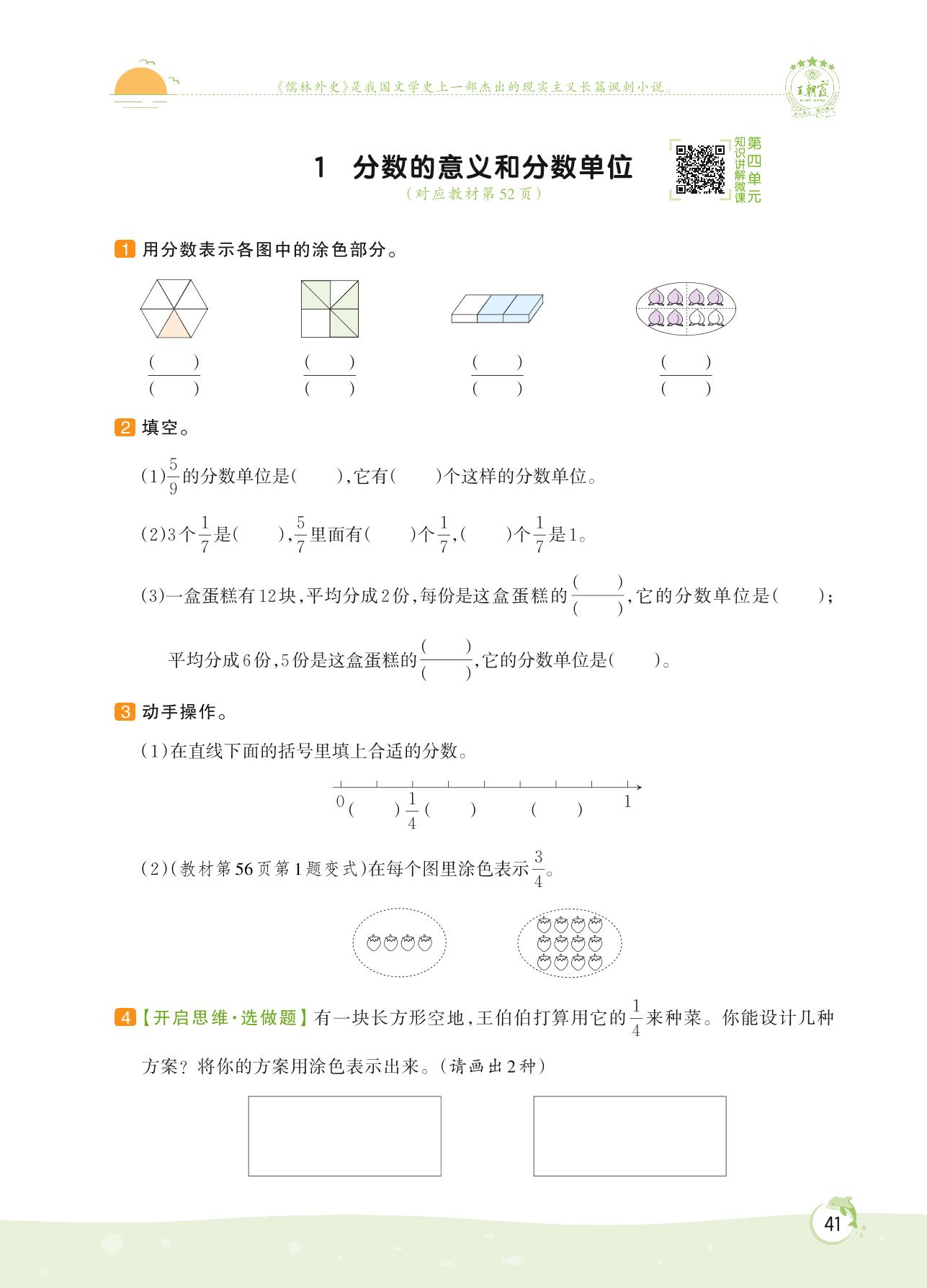 2022下册五年级数学苏教版 第四单元——1 分数的意义和分数单位