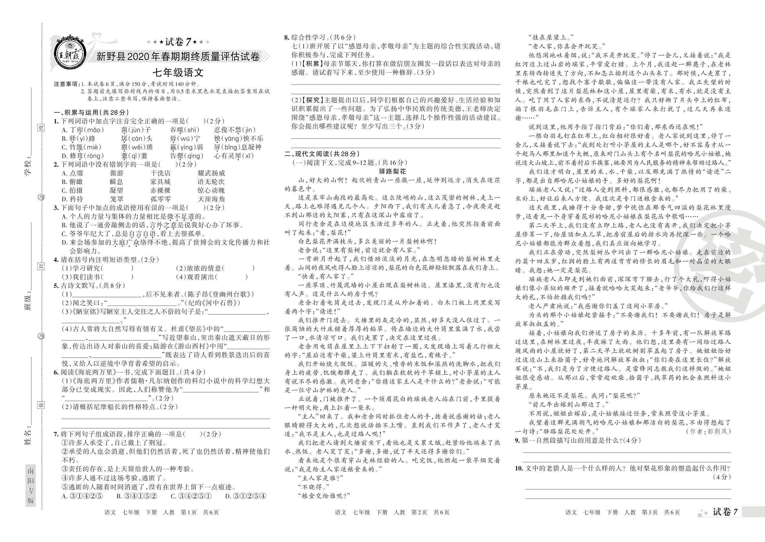 2019-2020学年第二学期南阳市新野县七年级语文试卷(人教版)【7】