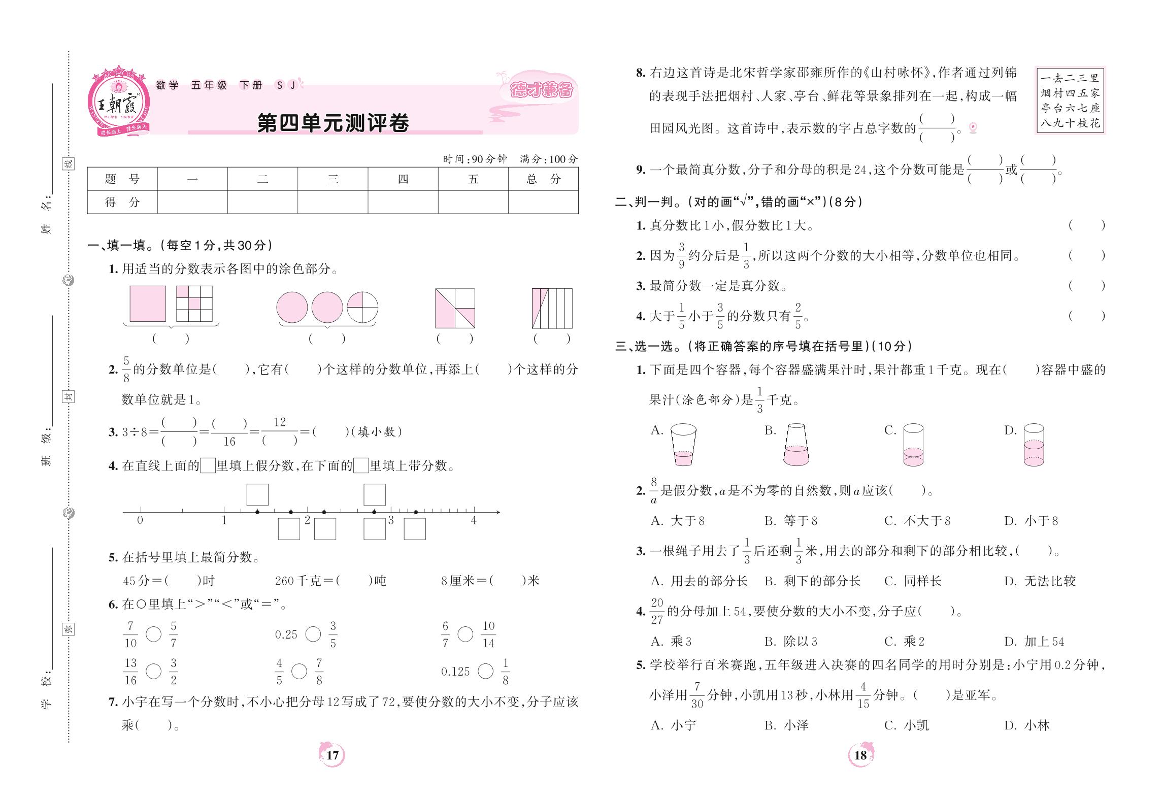 2022下册五年级数学苏教版 第四单元测评卷