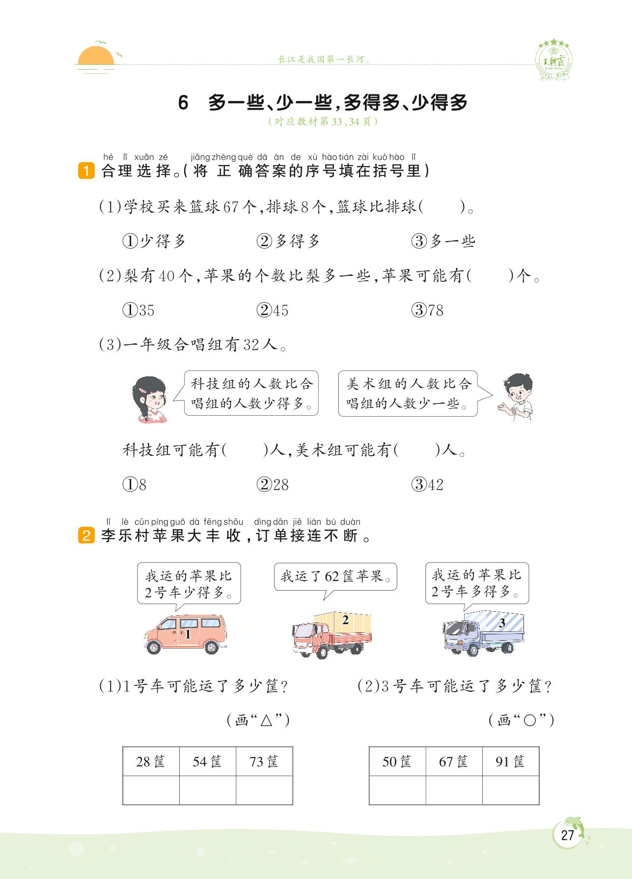 2022下册一年级数学苏教版 第三单元——6 多一些、少一些,多得多、少得多