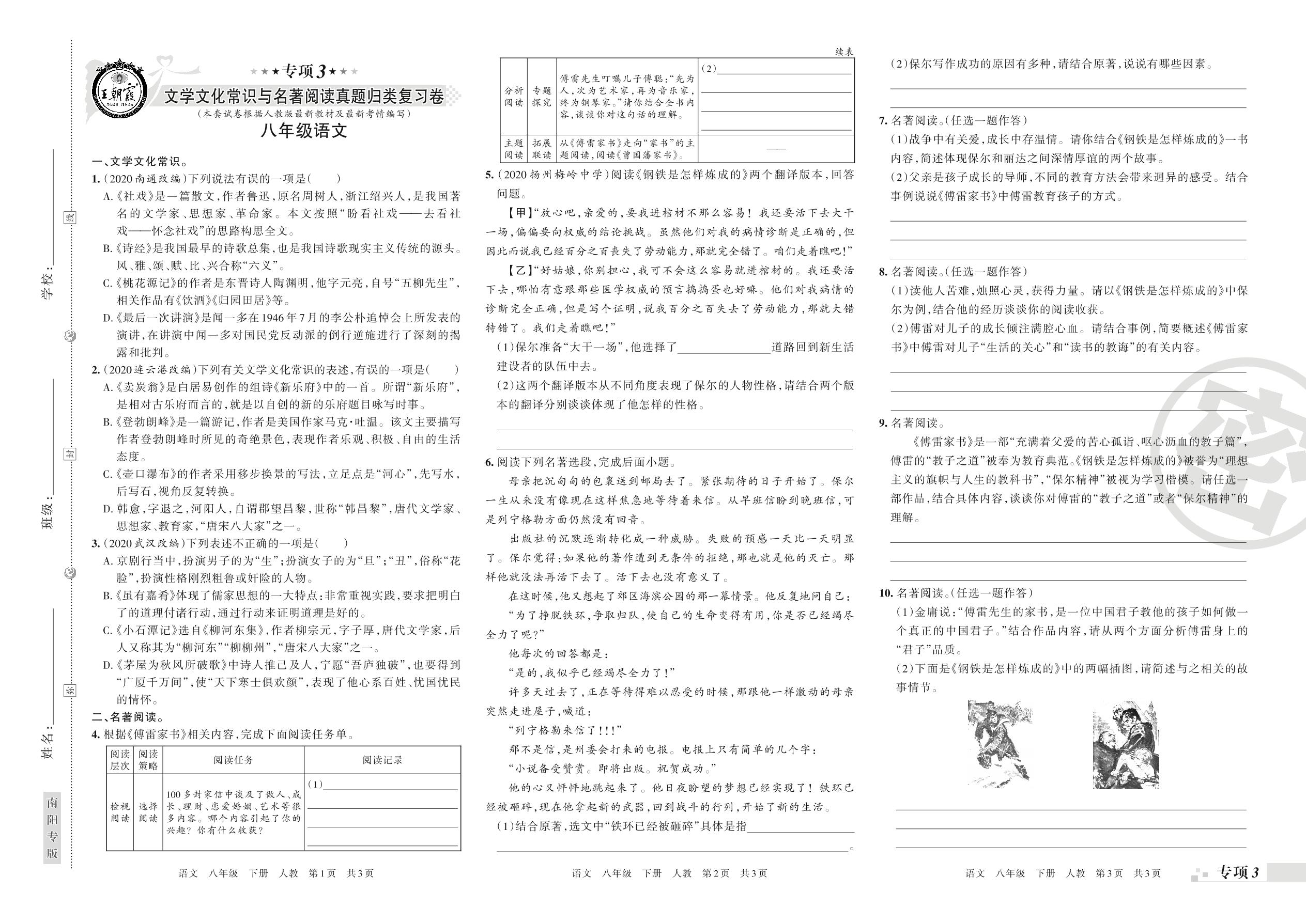 王朝霞期末专项卷——文学文化常识与名著阅读、综合性学习真题归类复习八年级下册语文(人教版)【0】