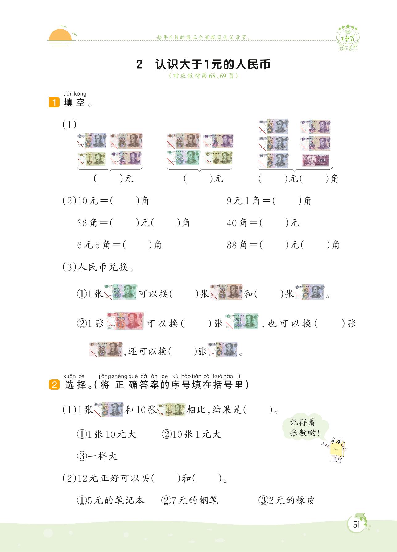 2022下册一年级数学苏教版 第五单元——2 认识大于1元的人民币