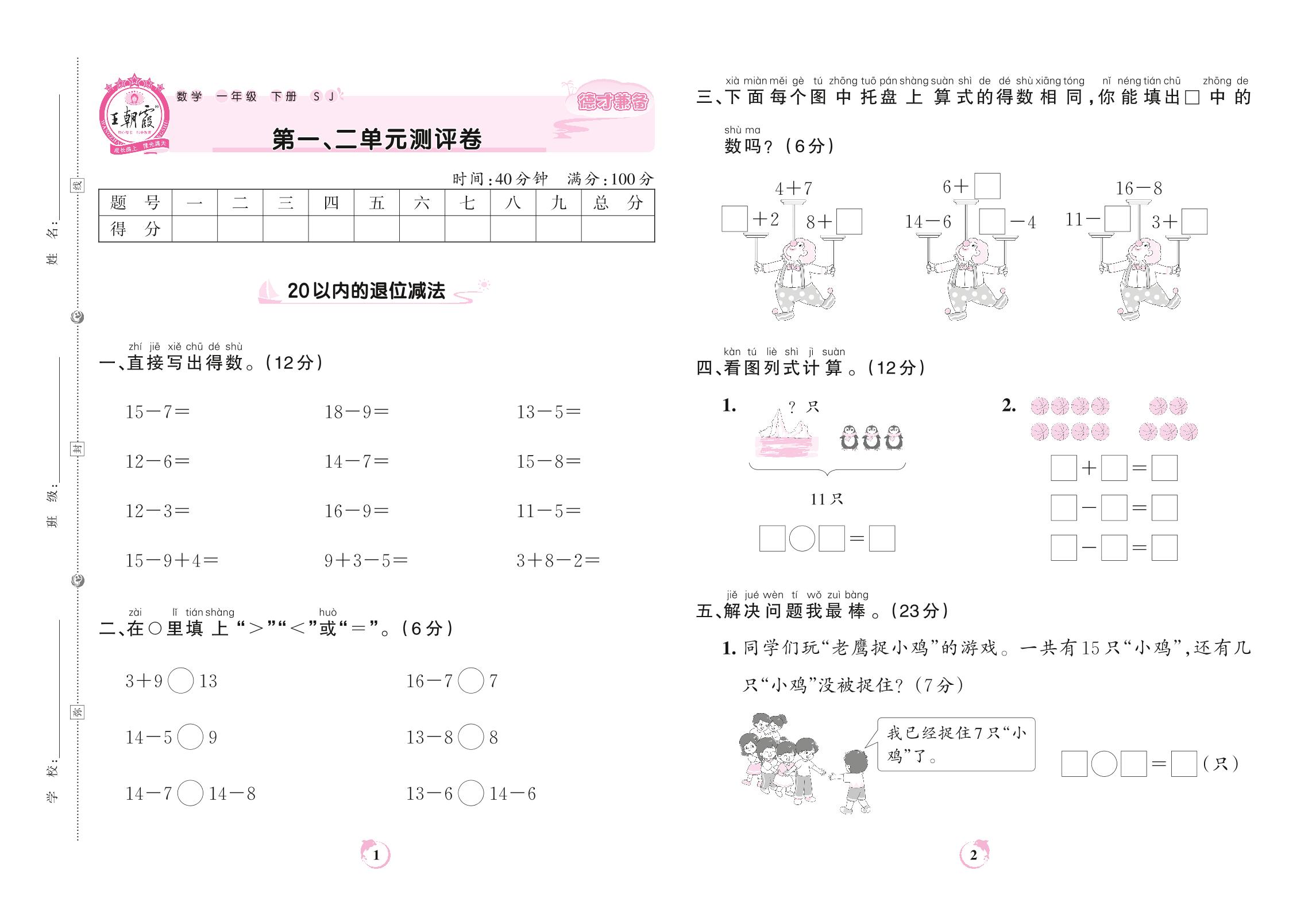 2022下册一年级数学苏教版 第一、二单元测评卷