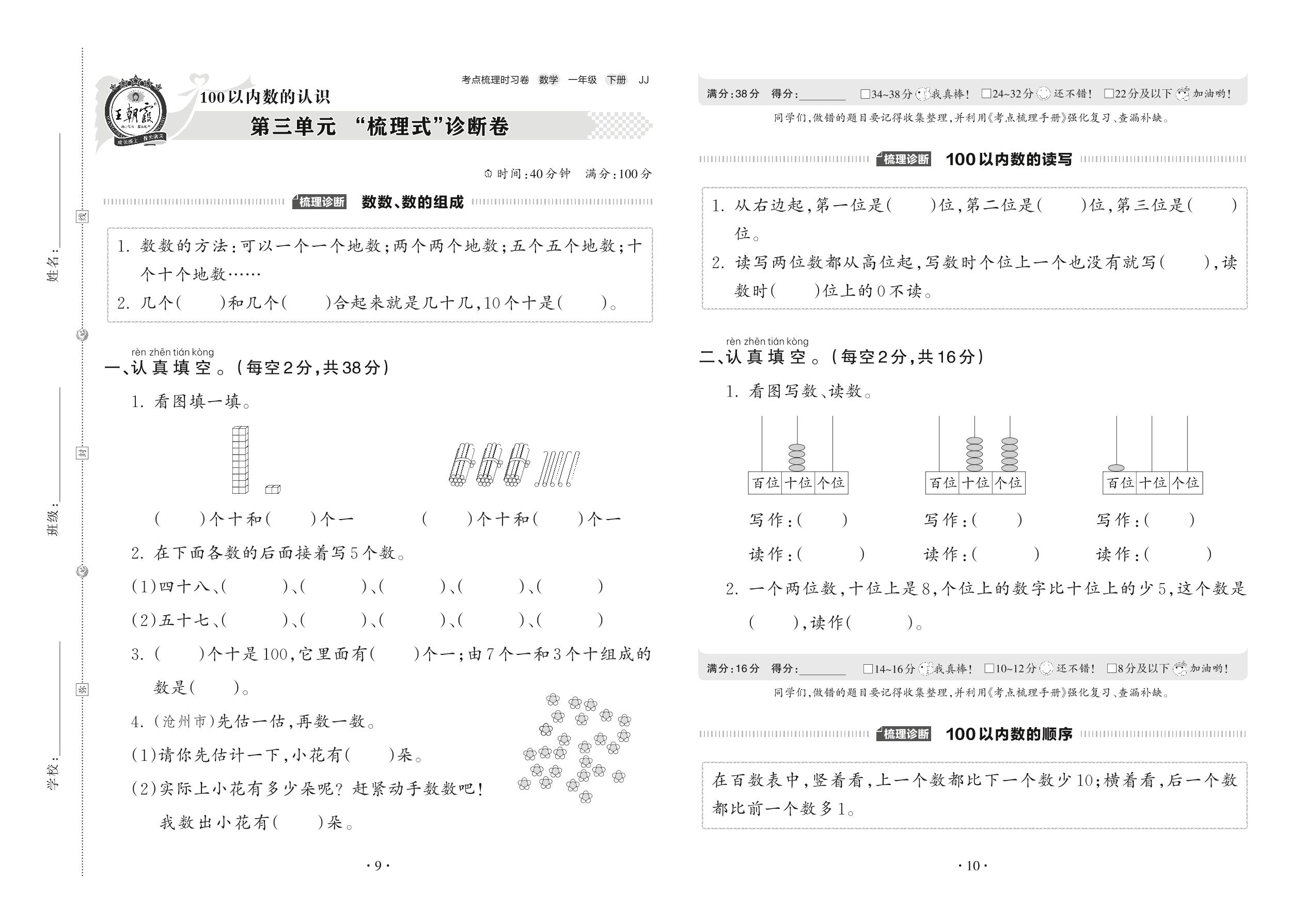 2022下册一年级数学冀教版 第三单元 “梳理式”诊断卷