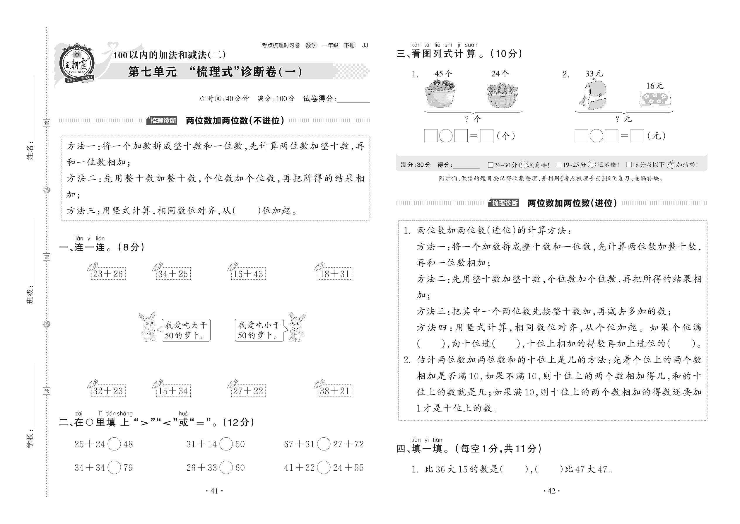 2022下册一年级数学冀教版 第七单元 “梳理式”诊断卷(一)
