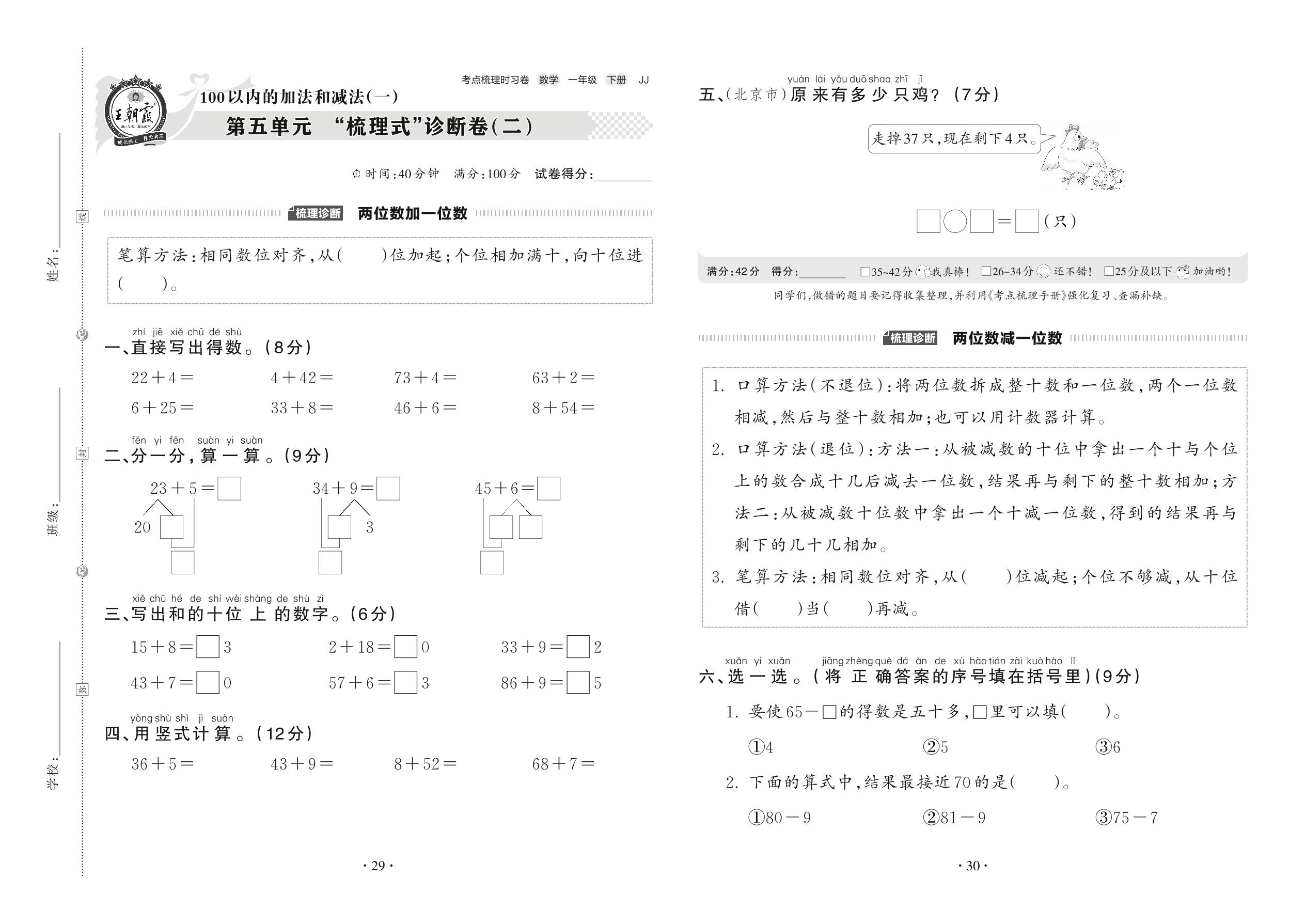 2022下册一年级数学冀教版 第五单元 “梳理式”诊断卷(二)