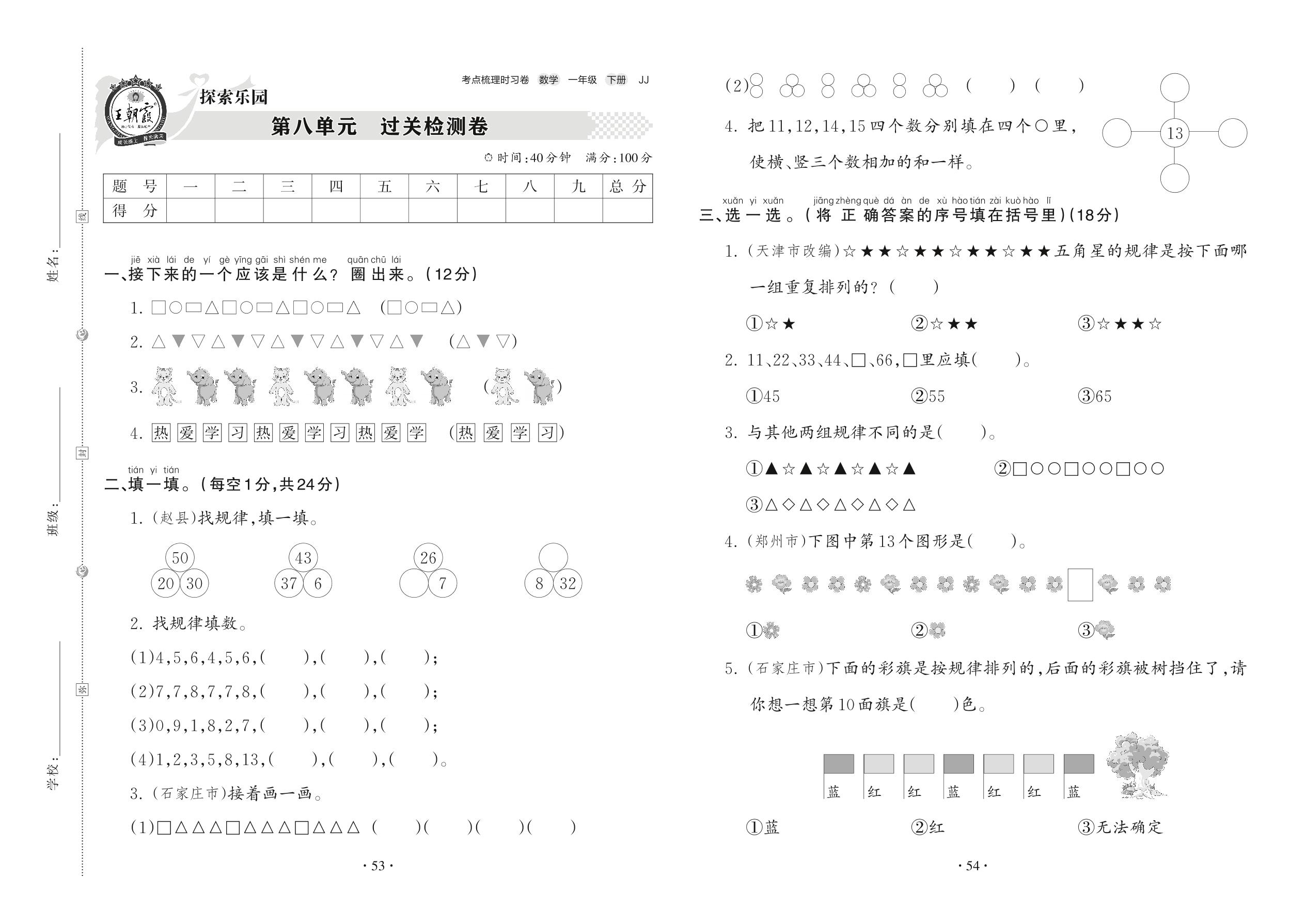2022下册一年级数学冀教版 第八单元 过关检测卷