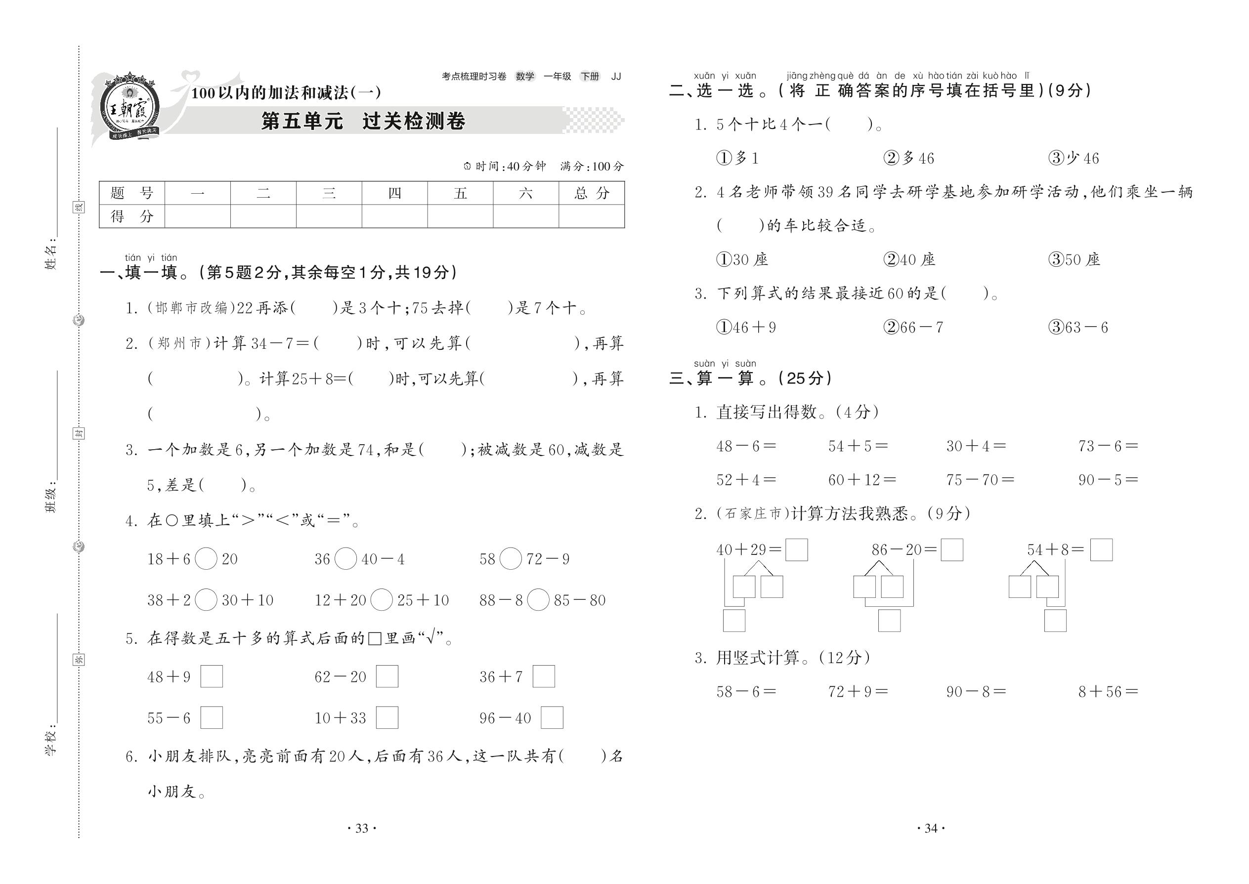 一年级数学冀教版下册单元卷