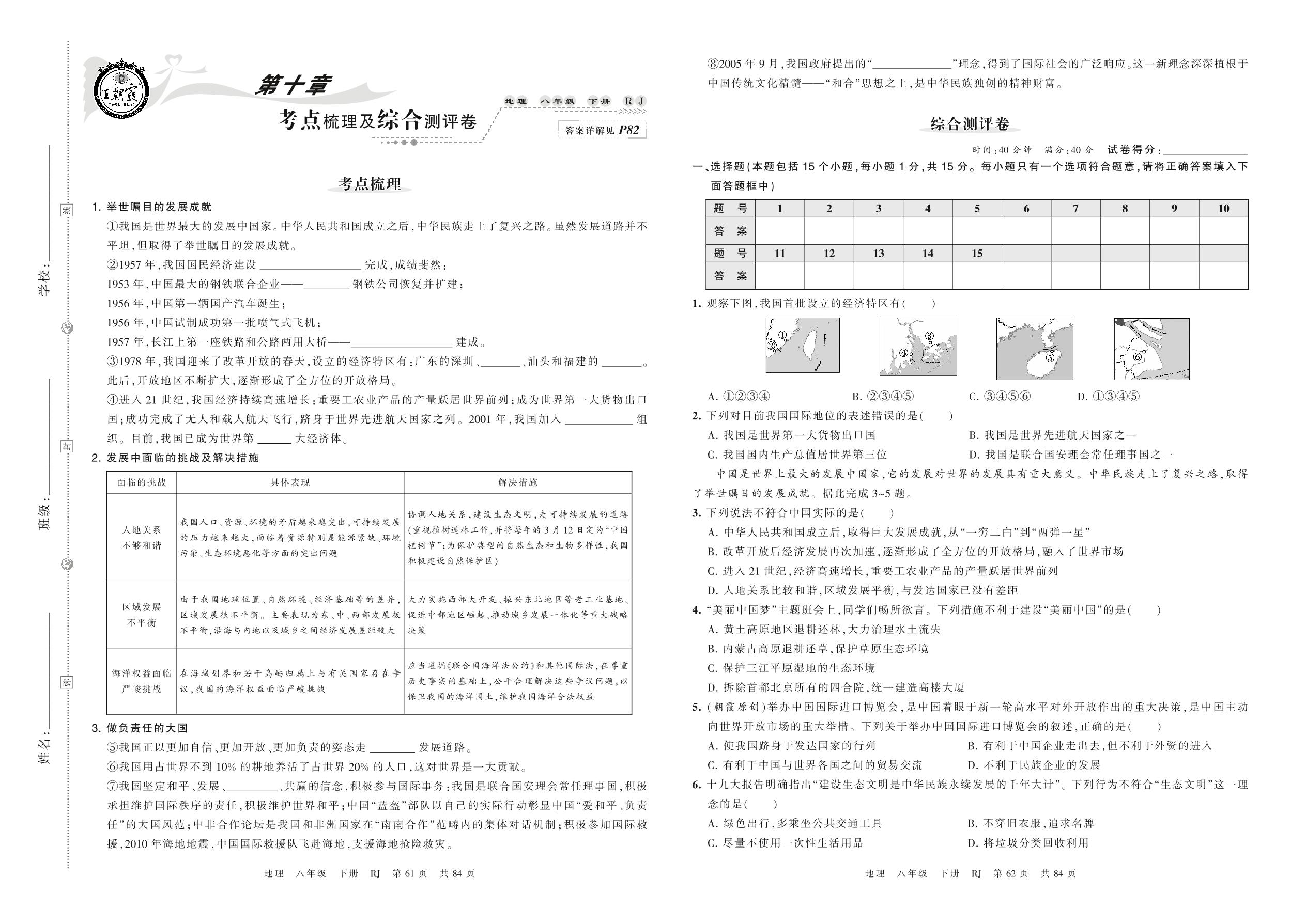 2022下册八年级地理人教版 第十章 考点梳理及综合测评卷