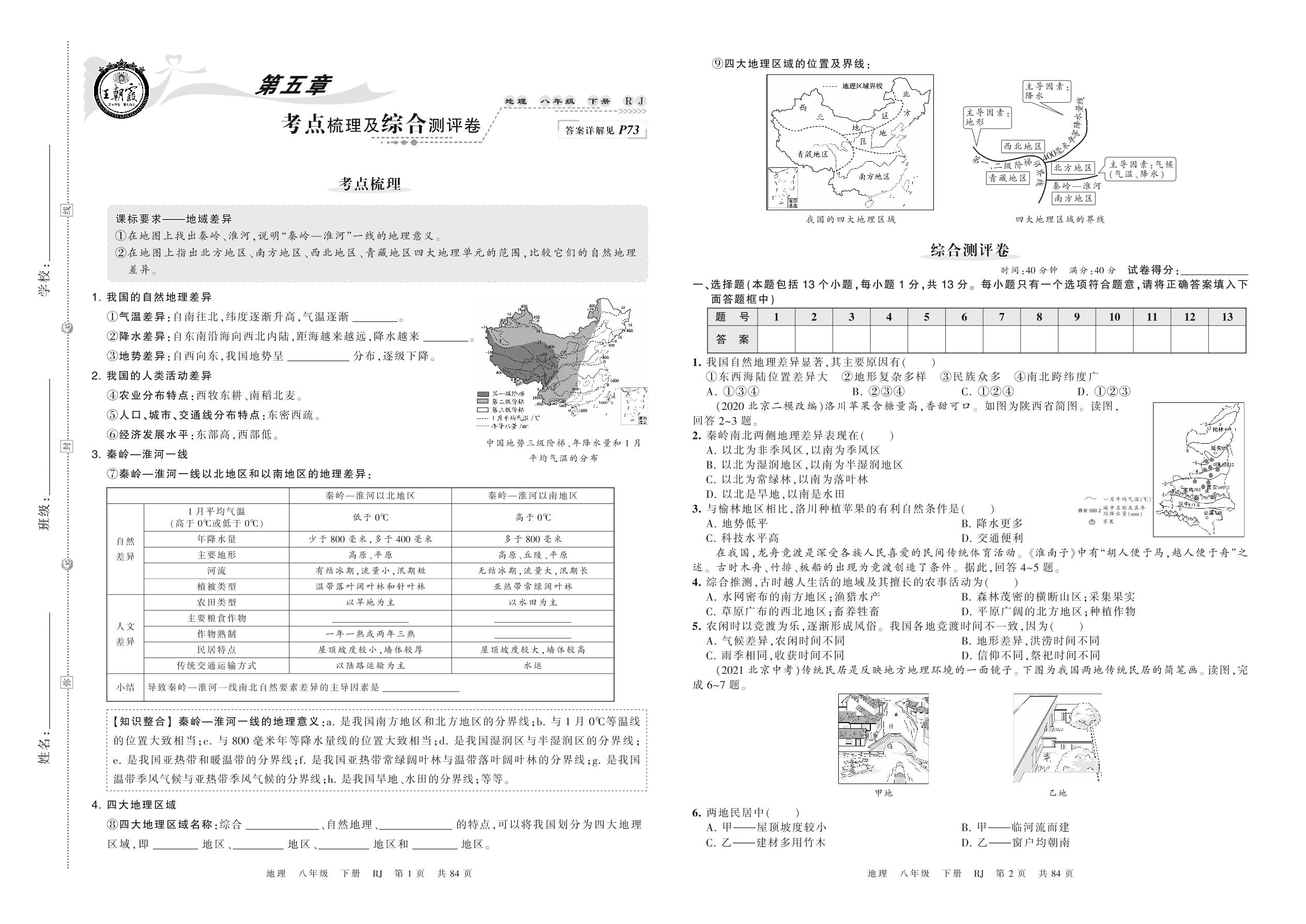 2022下册八年级地理人教版 第五章 考点梳理及综合测评卷