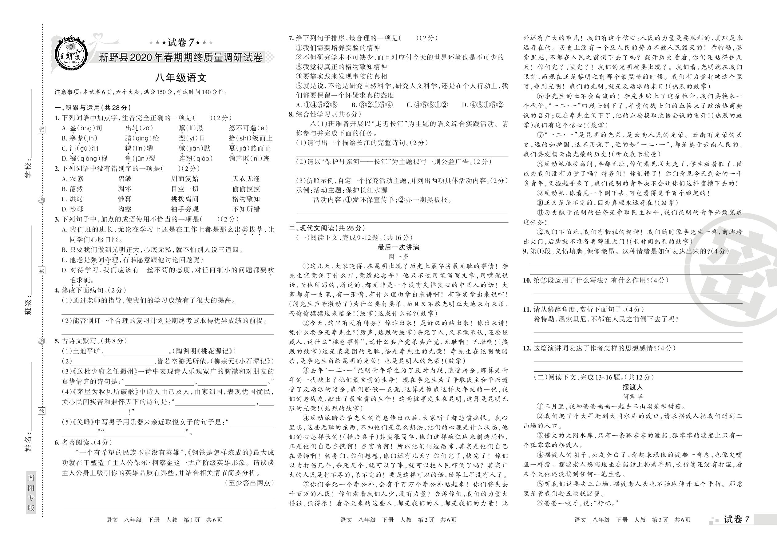 2019-2020学年第二学期南阳市新野县八年级语文试卷(人教版)【7】