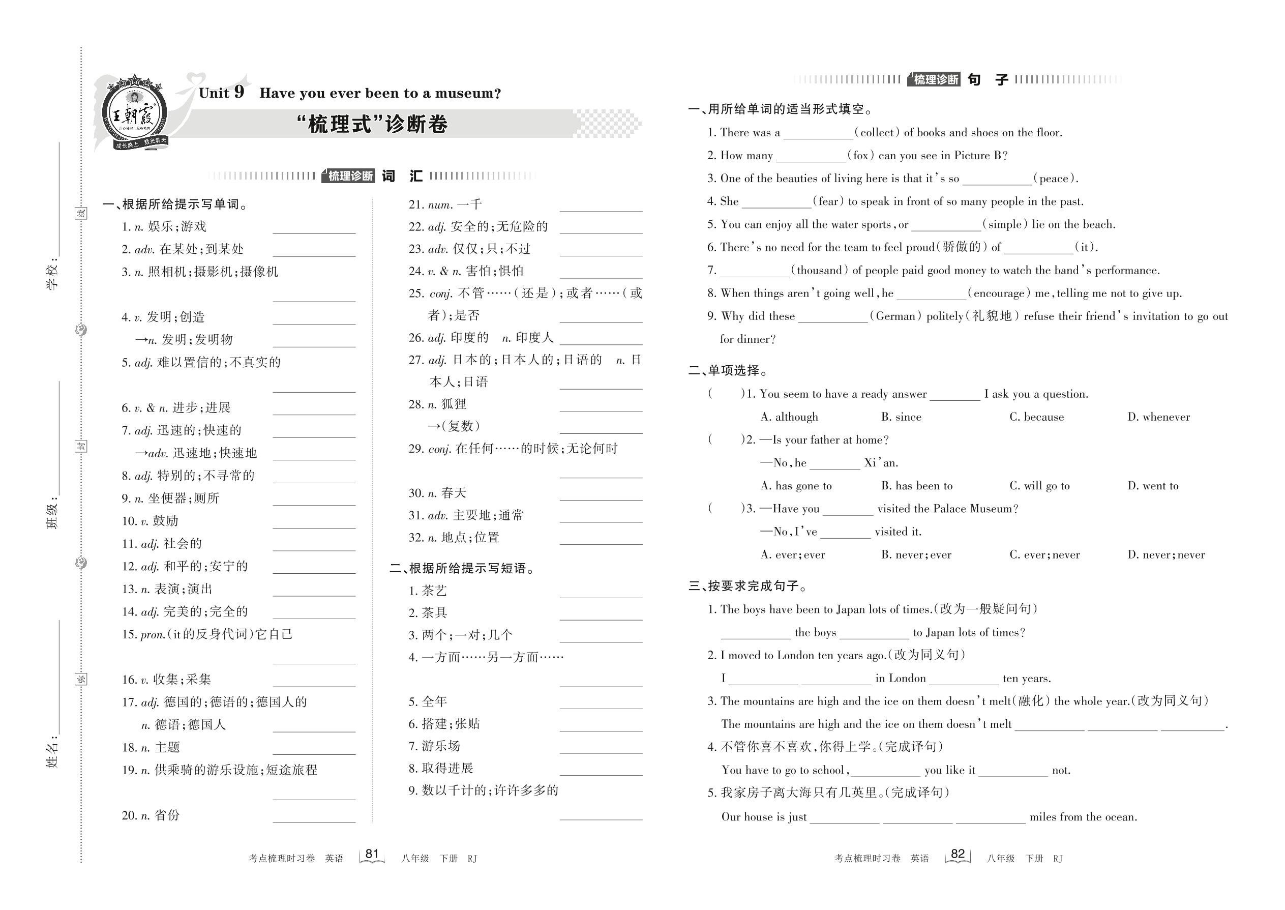 2022下册八年级英语人教版 Unit 9 “梳理式”诊断卷