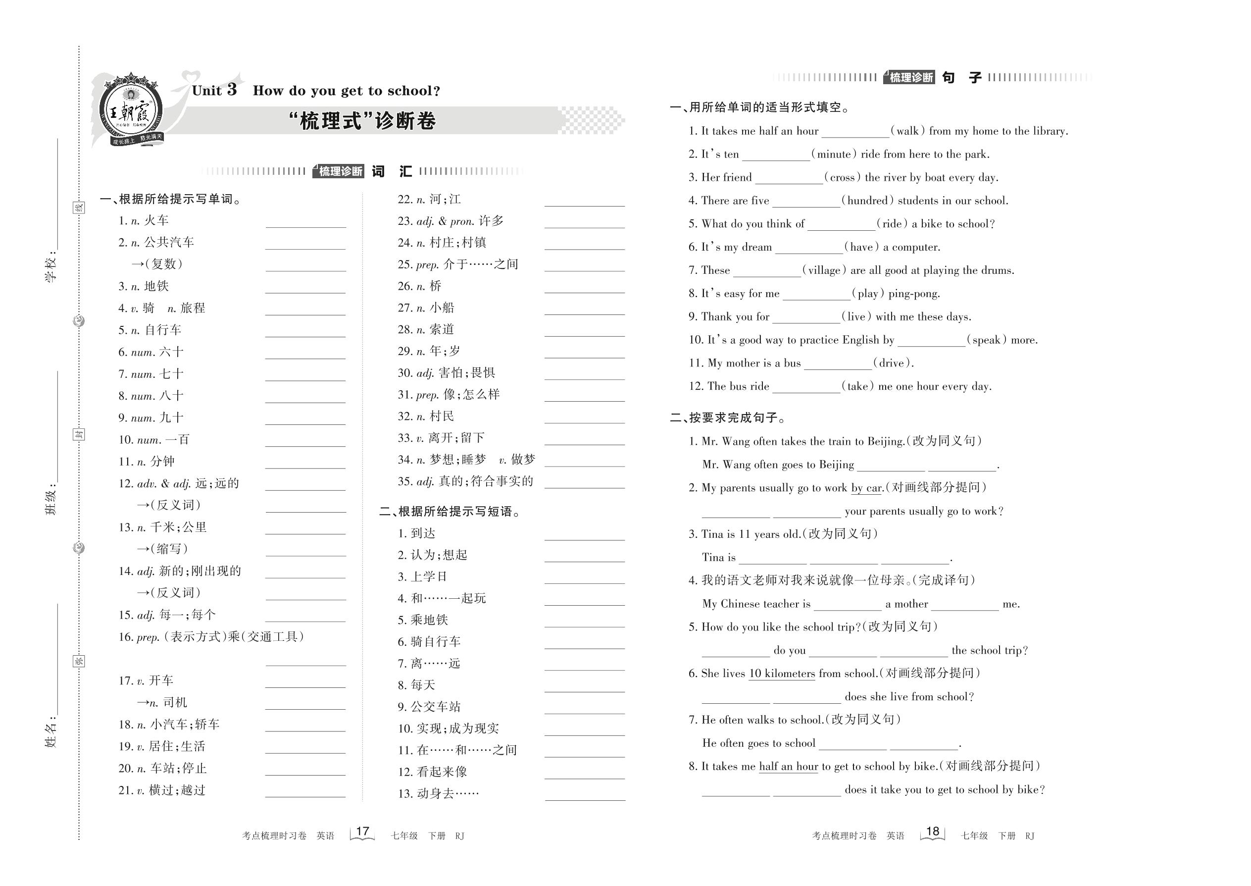 2022下册七年级英语人教版 Unit 3 “梳理式”诊断卷