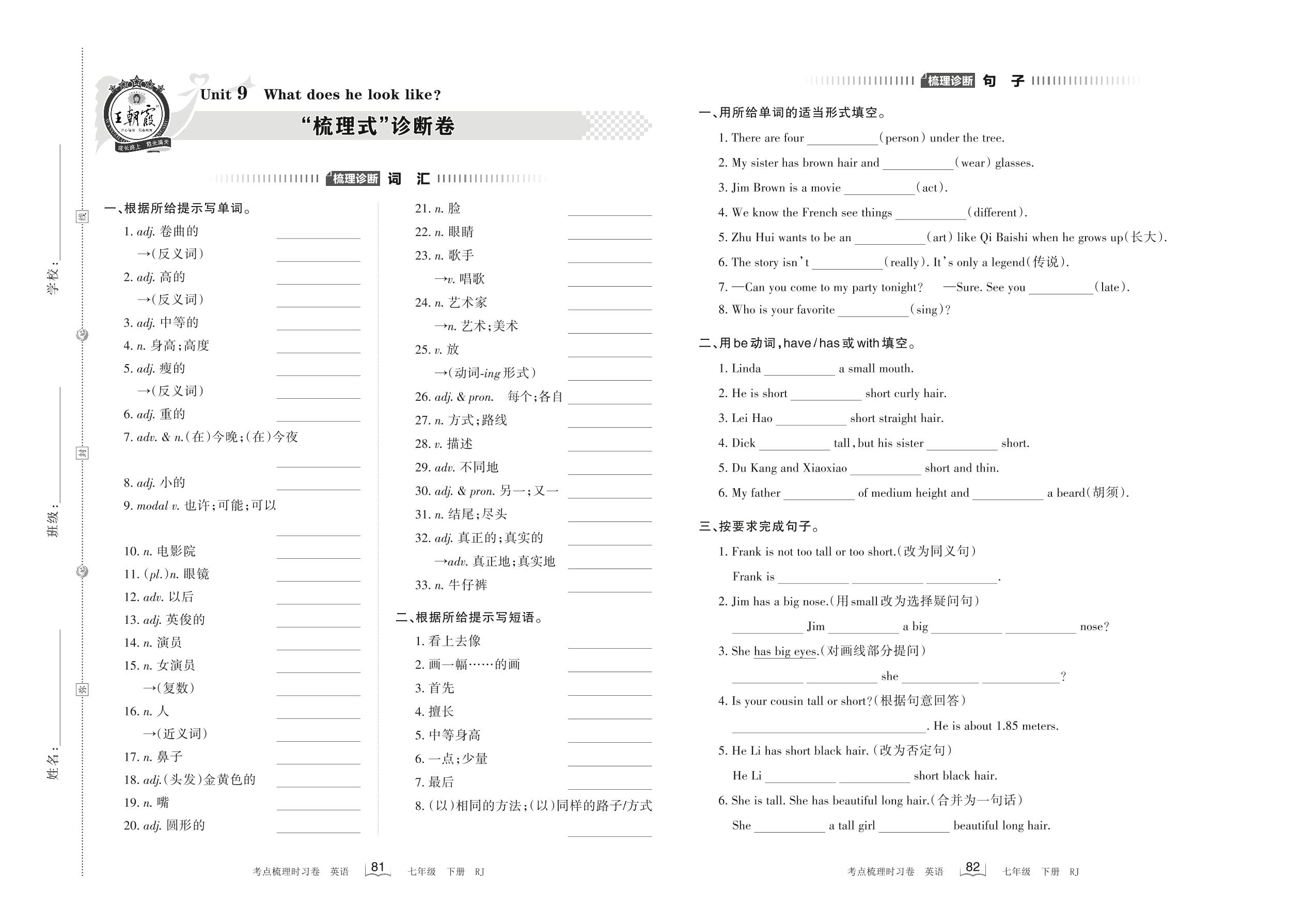 2022下册七年级英语人教版 Unit 9 “梳理式”诊断卷