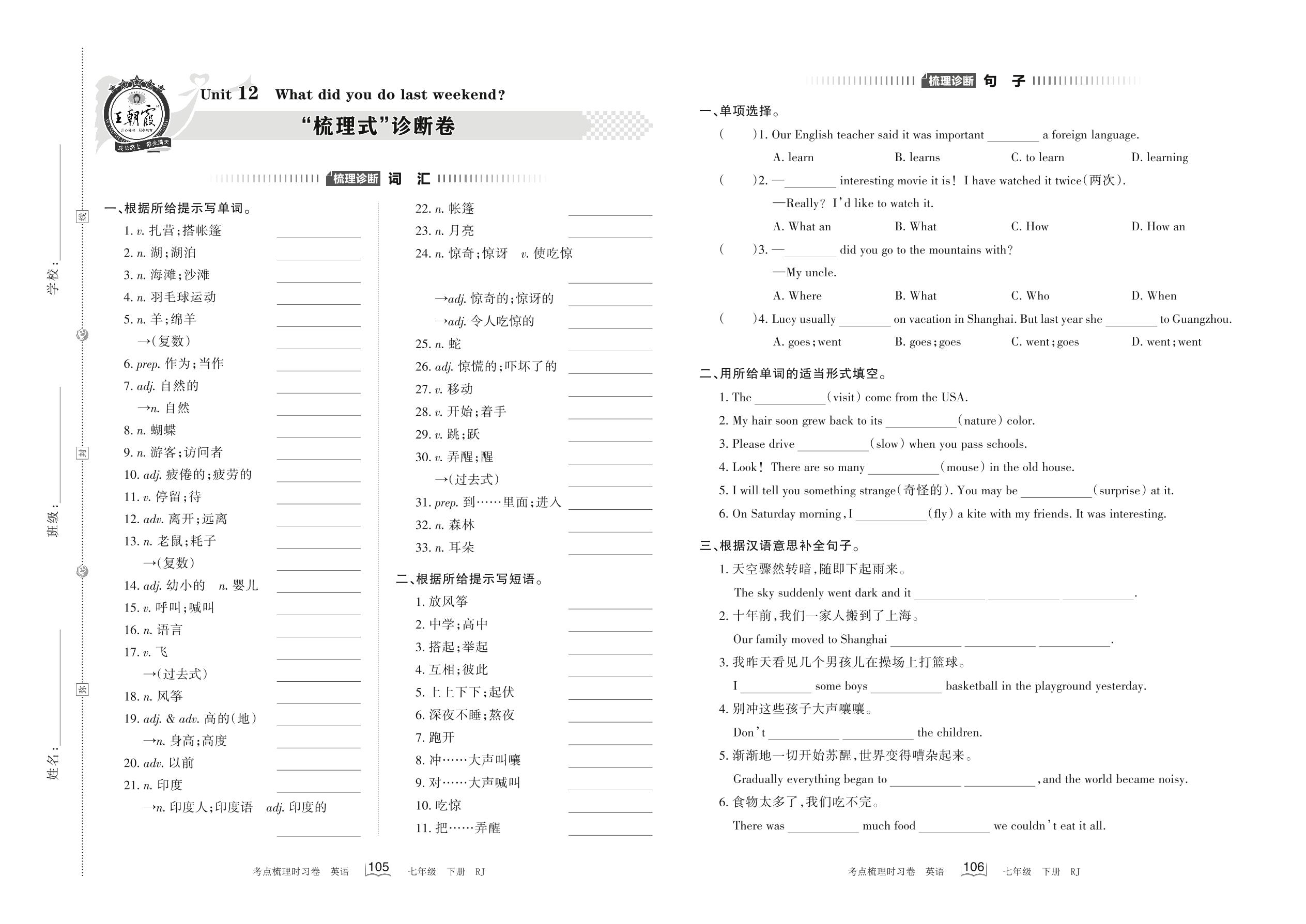 2022下册七年级英语人教版 Unit 12 “梳理式”诊断卷