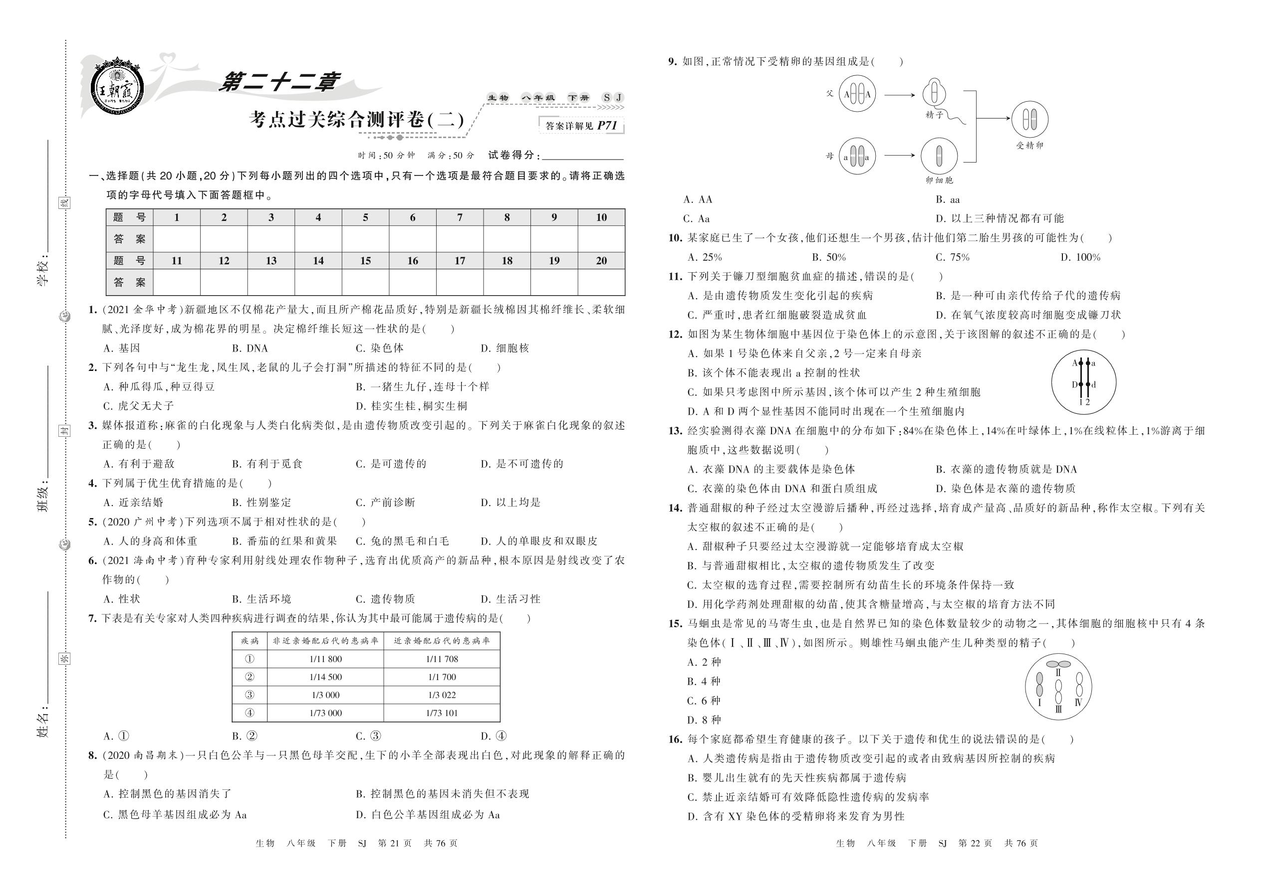 2022下册八年级生物苏教版 第二十二章 考点过关综合测评卷(二)