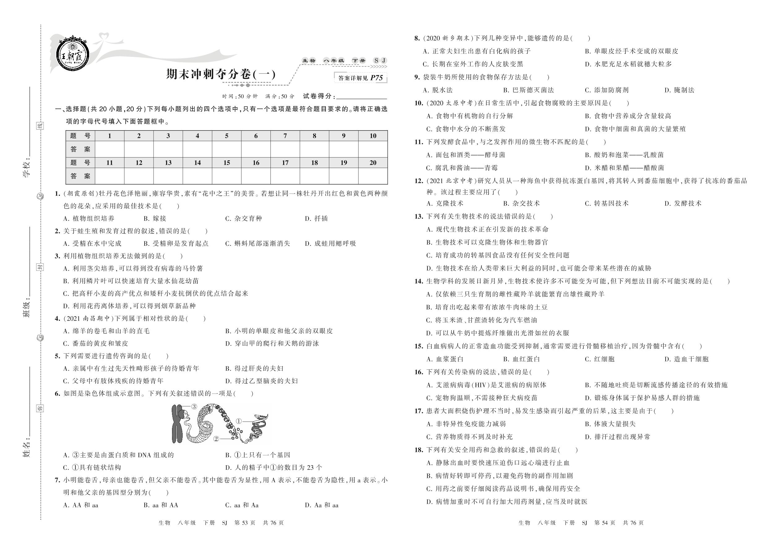 2022下册八年级生物苏教版 期末冲刺夺分卷(一)