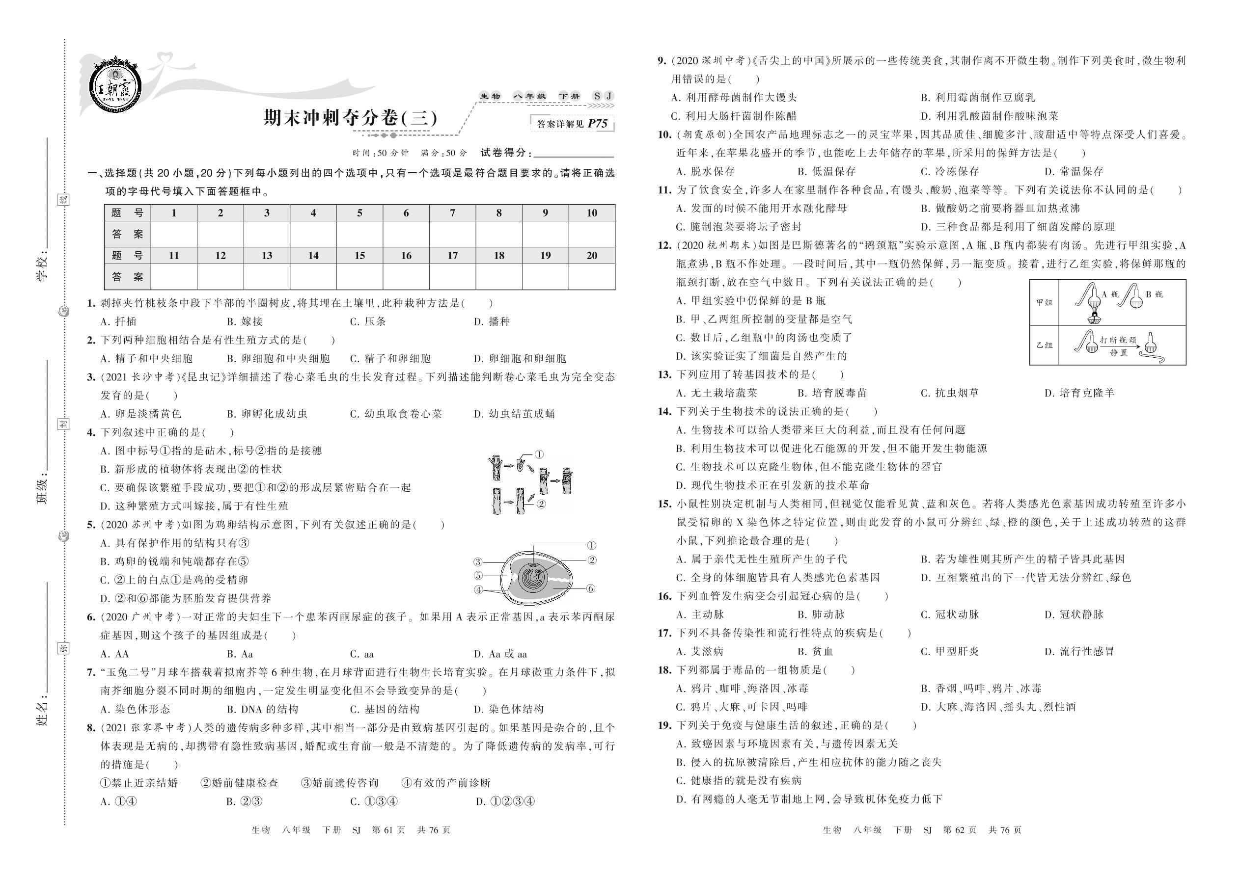 2022下册八年级生物苏教版 期末冲刺夺分卷(三)