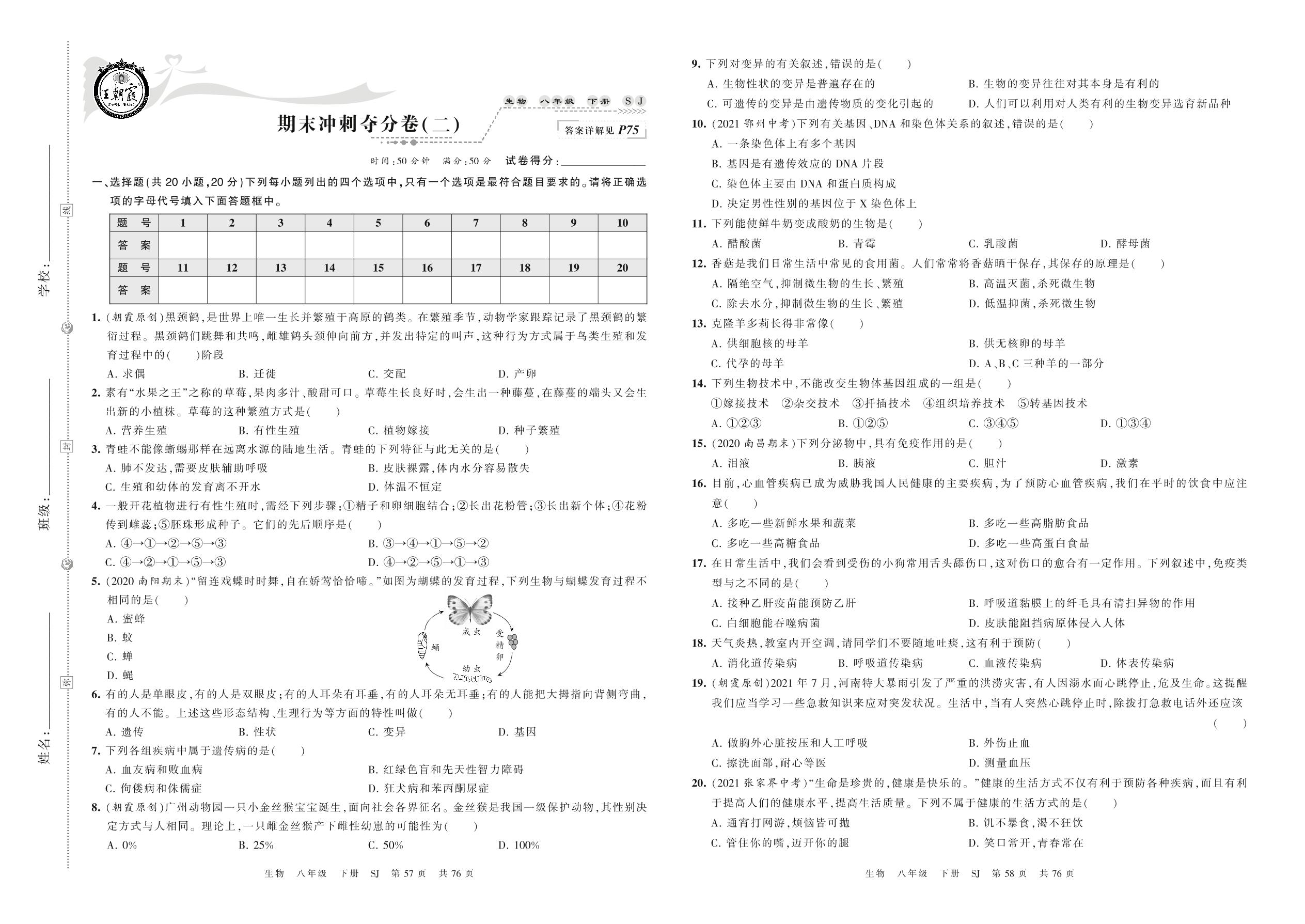 2022下册八年级生物苏教版 期末冲刺夺分卷(二)